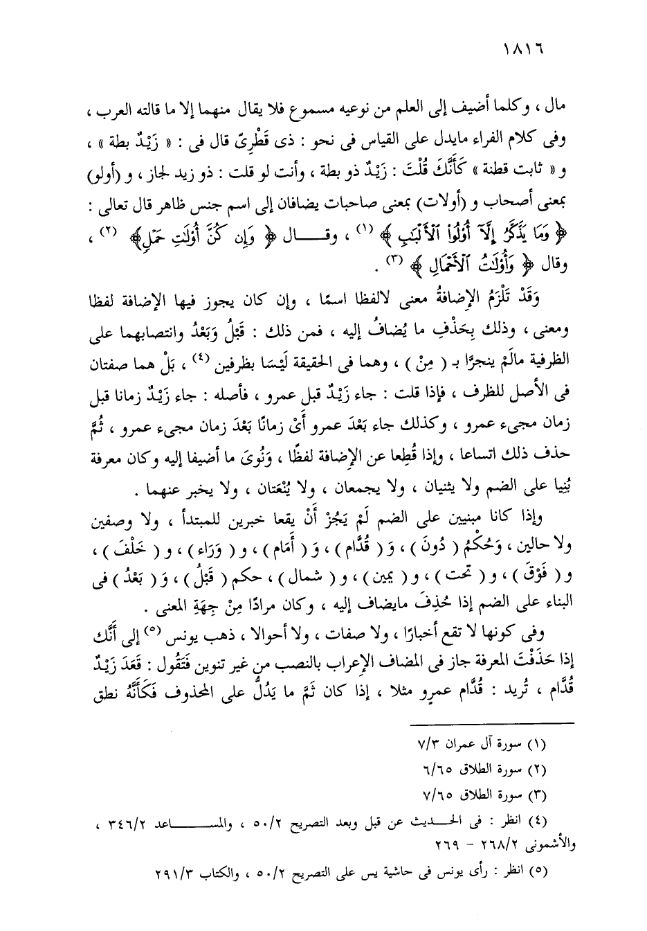 مال، وكلما أضيف إلى العلم من نوعيه مسموع فلا يقال منهما إلا ما قالته العرب، وفي كلام الفراء ما يدل على القياس في نحو: ذي قطرى قال في: «زيد بطة»، و «ثابت قطنة» كأنك قلت: زيد ذو بطة، وأنت لو قلت: ذو زيد لجاز، و (أولو) بمعنى أصحاب و (أولات) بمعنى صاحبات يضافان إلى اسم جنس ظاهر قال تعالى: «وما يذكر إلا أولوا الألباب»، وقال «وإن كن أولات حمل» وقال «وأولات الأحمال».