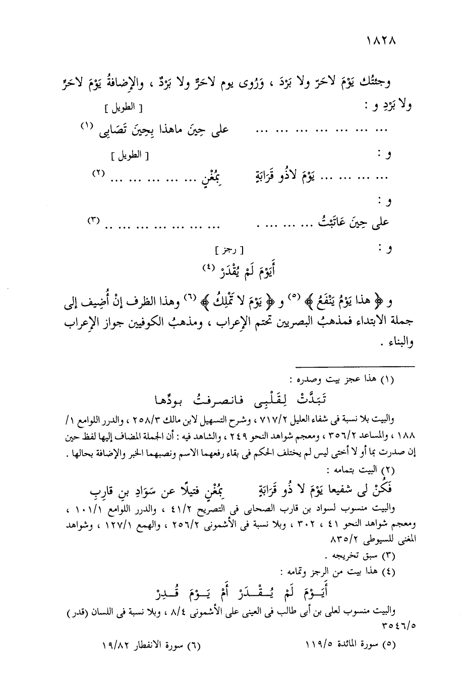 و «هذا يوم ينفع» و «يوم لا تملك» وهذا الظرف إن أضيف إلى جملة الابتداء فمذهب البصريين تحتم الإعراب، ومذهب الكوفيين جواز الإعراب والبناء.