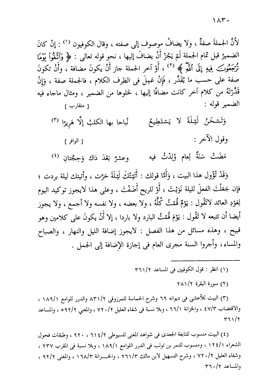 وقد تؤول هذا البيت، وأما قولك: أتيتك ليلة حرت، وأتيتك ليلة بردت؛ فإن جعلت الفعل لليلة نويت، أو للريح أضفت، وعلى هذا لا يجوز توكيد اليوم لعود العائد لا تقول: يوم قمت كله، ولا بعضه، ولا نفسه ولا أجمع، ولا يجوز أيضًا أن تتبعه لا تقول: يوم قمت البارد ولا باردا، إلا أن يكون على كلامين وهو قبيح، وهذه مسائل من هذا الفصل: لا يجوز إضافة الليل والنهار، والصباح والمساء، وأجروا السنة مجرى العام في إجازة الإضافة إلى الجمل.