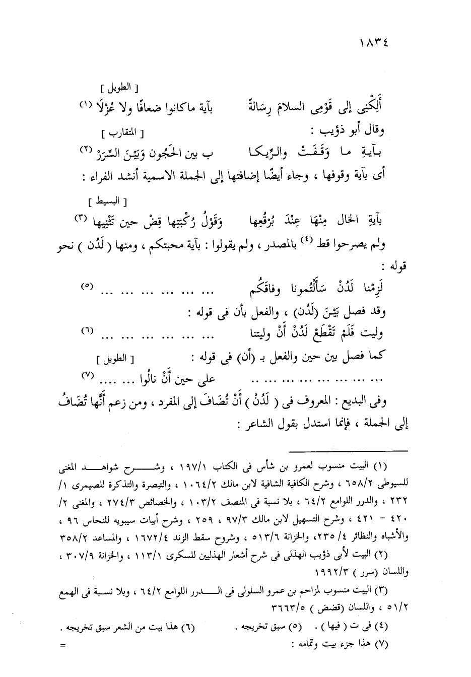 ولم يصرحوا قط بالمصدر، ولم يقولوا: بآية محبتكم، ومنها (لدن) نحو قوله: