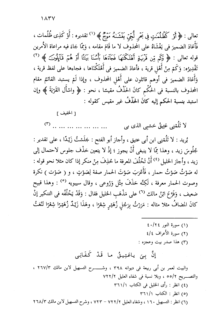 تعالى: «أو كظلمات في بحر لجي يغشاه موج» تقديره: أو كذي ظلمات، فأعاد الضمير في يغشاه على المحذوف لا ما قام مقامه، ومما جاء فيه مراعاة الأمرين قوله تعالى: «وكم من قرية أهلكناها فجاءها بأسنا أو هم قائلون» تقديره: وكم من أهل قرية، فأعاد الضمير في أهلكناها، فجاءها على لفظ قرية، وأعاد الضمير في أوهم قائلون على أهل المحذوف، وإذا لم يستبد القائم مقام المحذوف بالنسبة في الحكم كان الحذف مقيسًا، نحو: «واسأل القرية» وإن استبد بنسبة الحكم إليه كان الحذف غير مقيس كقوله: