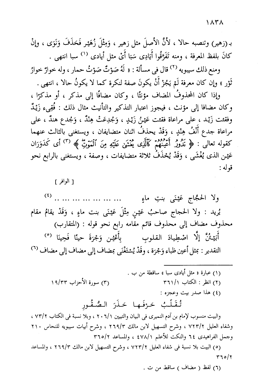 وإذا كان المحذوف المضاف مؤنثًا، وكان مضافًا إلى مذكر، أو مذكرًا، وكان مضافًا إلى مؤنث، فيجوز اعتبار التذكير والتأنيث مثال ذلك: فقئ زيد وفقئت زيد، على مراعاة فقئت عين زيد، وجدعت هند، وجدع هند، على مراعاة جدع أنف هند، وقد يحذف اثنان متضايفان، ويستغنى بالثالث عنهما كقوله تعالى: «تدور أعينهم كالذي يغشى عليه من الموت» أي كدوران عين الذي يغشى، وقد يحذف ثلاثة متضايفات، وصفة، ويستغنى بالرابع نحو قوله: