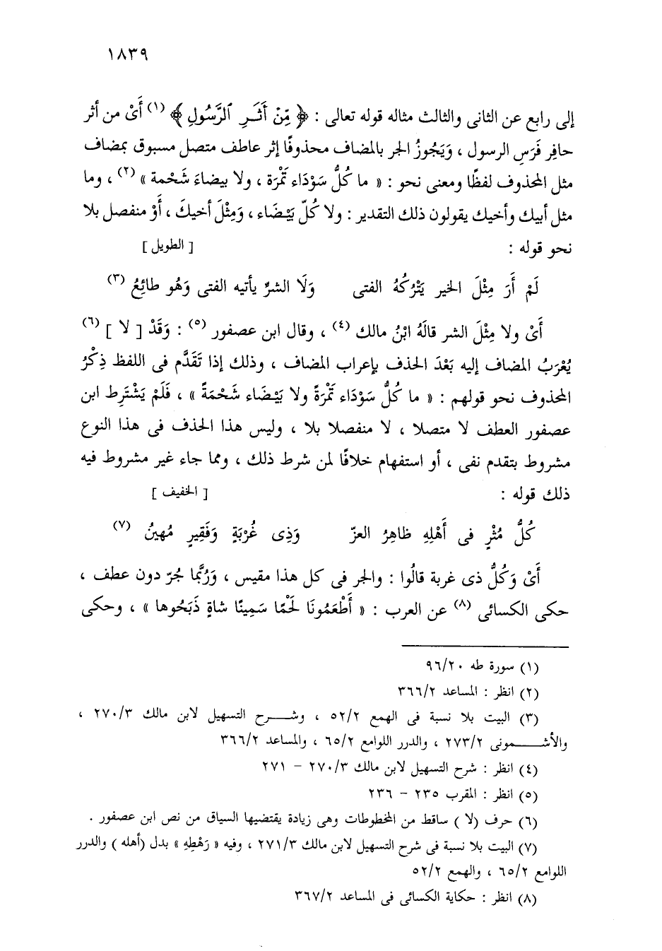 إلى رابع عن الثاني والثالث مثاله قوله تعالى: «من أثر الرسول» أي من أثر حافر فرس الرسول، ويجوز الجر بالمضاف محذوفًا إثر عاطف متصل مسبوق بمضاف مثل المحذوف لفظًا ومعنى نحو: «ما كل سوداء تمرة، ولا بيضاء شحمة»، وما مثل أبيك وأخيك يقولون ذلك التقدير: ولا كل بيضاء، ومثل أخيك، أو منفصل بلا نحو قوله: