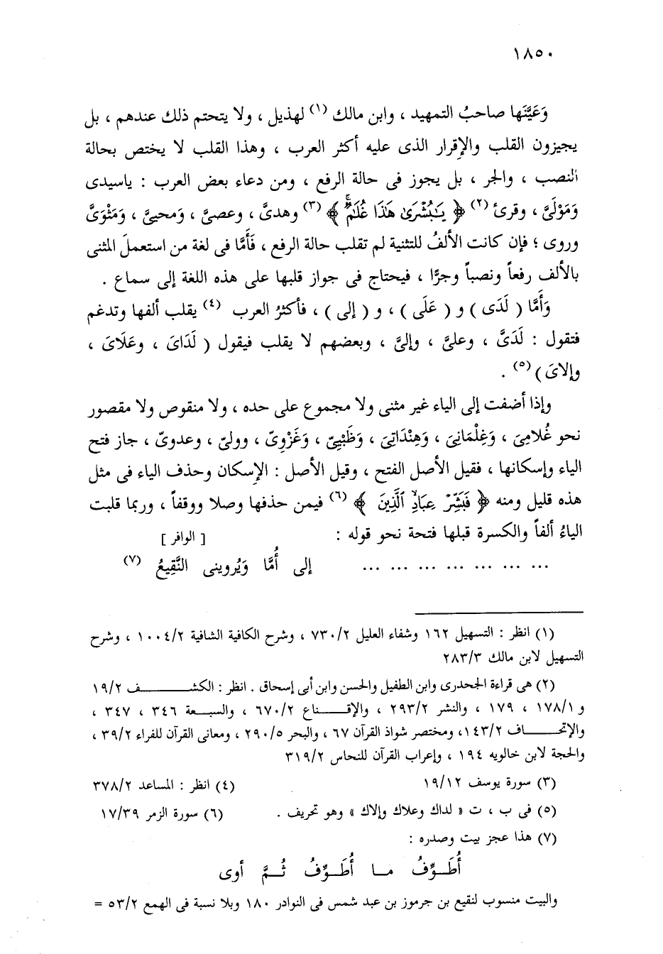 وعينها صاحب التمهيد، وابن مالك لهذيل، ولا يتحتم ذلك عندهم، بل يجيزون القلب والإقرار الذي عليه أكثر العرب، وهذا القلب لا يختص بحالة النصب، والجر، بل يجوز في حالة الرفع، ومن دعاء بعض العرب: يا سيدي ومولى، وقرئ «يا بشرى هذا غلام» وهدى، وعصى، ومحيى، ومثوى، وروى؛ فإن كانت الألف للتثنية لم تقلب حالة الرفع، فأما في لغة من استعمل المثنى بالألف رفعًا ونصبًا وجرًا، فيحتاج في جواز قلبها على هذه اللغة إلى سماع.