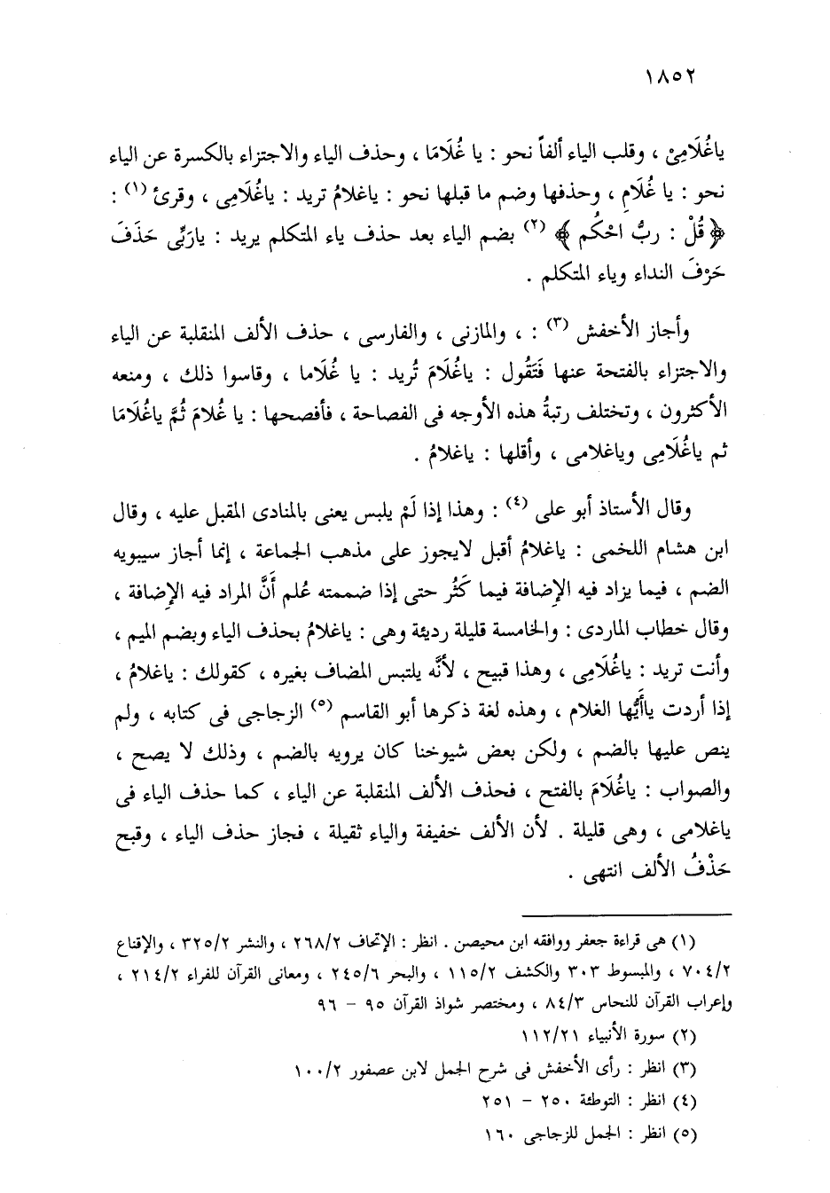 وأجاز الأخفش: والمازني، والفارسي، حذف الألف المنقلبة عن الياء والاجتراء بالفتحة عنها فتقول: يا غلام تريد: يا غلاما، وقاسوا ذلك، ومنعه الأكثرون، وتختلف رتبة هذه الأوجه في الفصاحة، فأفصحها: يا غلام ثم يا غلاما ثم يا غلامي ويا غلامي، وأقلها: يا غلام.