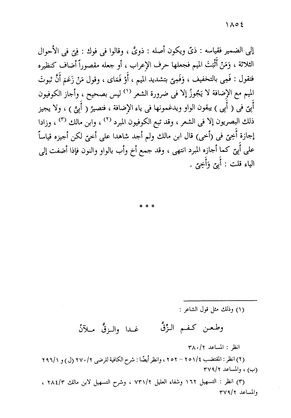 إلى الضمير فقياسه: ذي ويكون أصله: ذوى، وقالوا في فوك: في في الأحوال الثلاثة، ومن أثبت الميم فجعلها حرف الإعراب، أو جعله مقصورًا أضاف كنظيره فتقول: فمي بالتخفيف، وفمي بتشديد الميم، أو فماى، وقول من زعم أن ثبوت الميم مع الإضافة لا يجوز إلا في ضرورة الشعر ليس بصحيح، وأجاز الكوفيون أبي في (أبي) يبقون الواو ويدغمونها في ياء الإضافة، فتصير (أبي)، ولا يجيز ذلك البصريون إلا في الشعر، وقد تبع الكوفيون المبرد، وابن مالك، وزادا إجازة أخي في (أخي) قال ابن مالك ولم أجد شاهدًا على أخي لكن أجيزه قياسًا على أبي كما أجازه المبرد انتهى، وقد جمع أخ وأب بالواو والنون فإذا أضفت إلى الياء قلت: أبي وأخي.