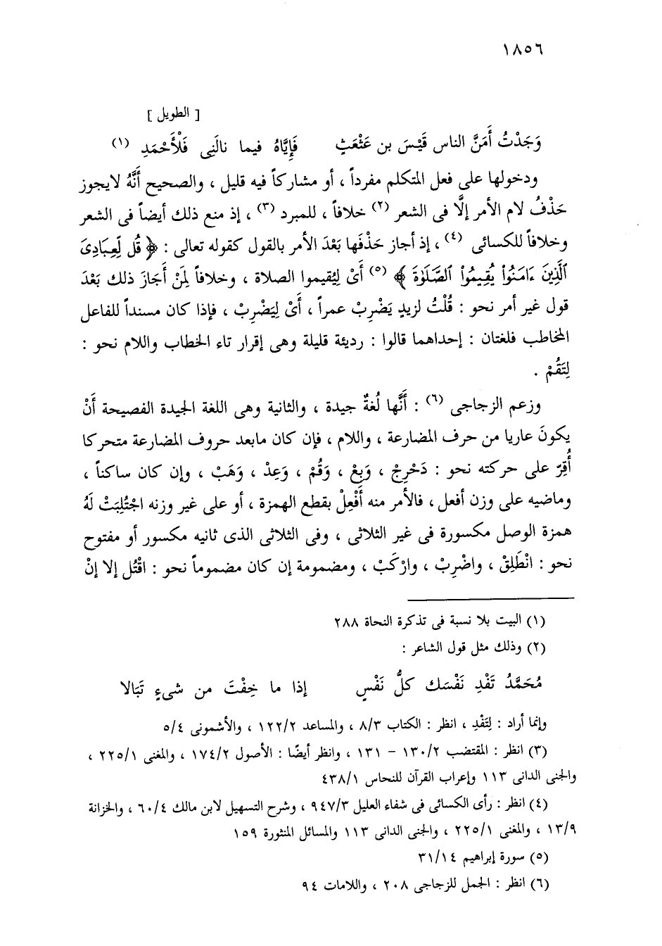 ودخولها على فعل المتكلم مفردًا، أو مشاركًا فيه قليل، والصحيح أنه لا يجوز حذف لام الأمر إلا في الشعر خلافًا، للمبرد، إذ منع ذلك أيضًا في الشعر وخلافًا للكسائي، إذ أجاز حذفها بعد الأمر بالقول كقوله تعالى: «قل لعبادي الذين آمنوا يقيموا الصلاة» أي ليقيموا الصلاة، وخلافًا لمن أجاز ذلك بعد قول غير أمر نحو: قلت لزيد يضرب عمرًا، أي ليضرب، فإذا كان مسندًا للفاعل المخاطب فلغتان: إحداهما قالوا: رديئة قليلة وهي إقرار تاء الخطاب واللام نحو: لتقم.