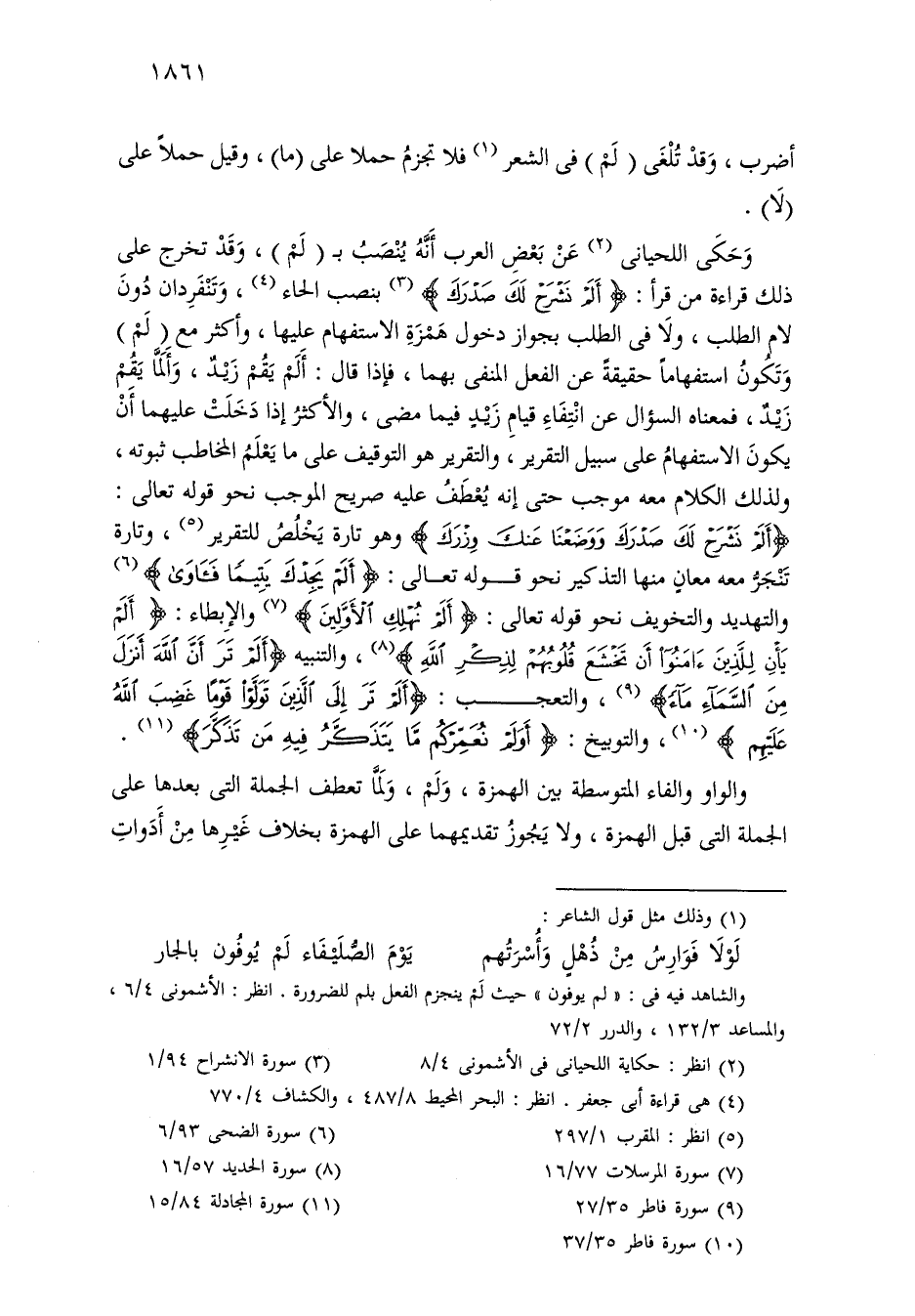 وحكى اللحياني عن بعض العرب أنه ينصب بـ (لم)، وقد تخرج على ذلك قراءة من قرأ: «ألم نشرح لك صدرك» بنصب الحاء، وتنفردان دون لام الطلب، ولا في الطلب بجواز دخول همزة الاستفهام عليها، وأكثر مع (لم) وتكون استفهامًا حقيقة عن الفعل المنفي بهما، فإذا قال: ألم يقم زيد، وألما يقم زيد، فمعناه السؤال عن انتفاء قيام زيد فيما مضى، والأكثر إذا دخلت عليهما أن يكون الاستفهام على سبيل التقرير، والتقرير هو التوقيف على ما يعلم المخاطب ثبوته، ولذلك الكلام معه موجب حتى إنه يعطف عليه صريح الموجب نحو قوله تعالى: «ألم نشرح لك صدرك ووضعنا عنك وزرك» وهو تارة يخلص للتقرير، وتارة تنجر معه معان منها التذكير نحو قوله تعالى: «ألم يجدك يتيما فآوى» والتهديد والتخويف نحو قوله تعالى: «ألم نهلك الأولين» والإبطاء: «ألم يأن للذين آمنوا أن تخشع قلوبهم لذكر الله»، والتنبيه «ألم تر أن الله أنزل من السماء ماء»، والتعجب: «ألم تر إلى الذين تولوا قومًا غضب الله عليهم»، والتوبيخ: «أولم نعمركم ما يتذكر فيه من تذكر».