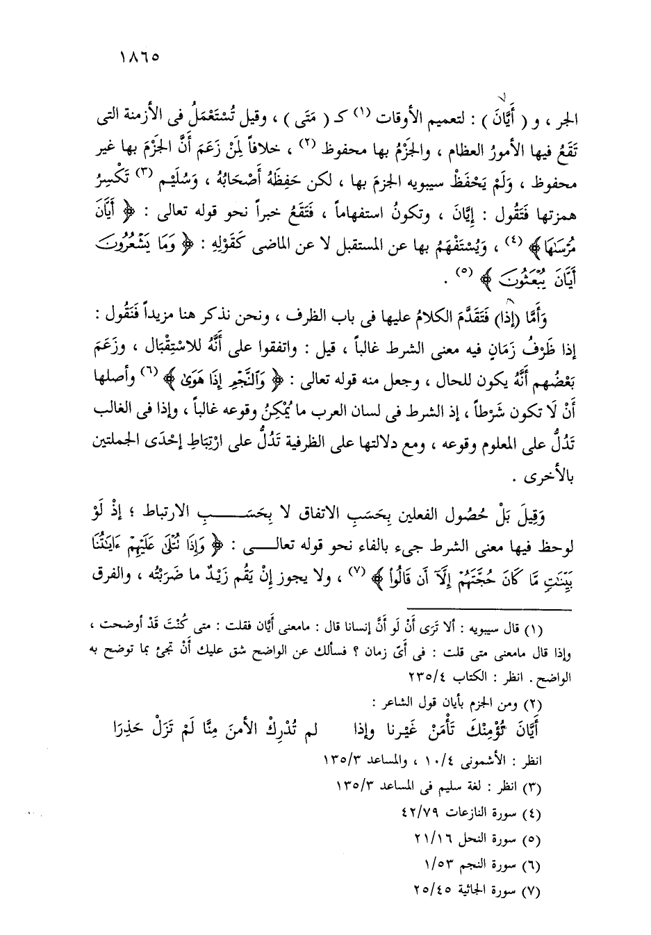 الجر، و (أيان): لتعميم الأوقات كـ (متى)، وقيل تستعمل في الأزمنة التي تقع فيها الأمور العظام، والجزم بها محفوظ، خلافًا لمن زعم أن الجزم بها غير محفوظ، ولم يحفظ سيبويه الجزم بها، لكن حفظه أصحابه، وسليم تكسر همزتها فتقول: إيان، وتكون استفهامًا، فتقع خبرًا نحو قوله تعالى: «أيان مرساها»، ويستفهم بها عن المستقبل لا عن الماضي كقوله: «وما يشعرون أيان يبعثون».