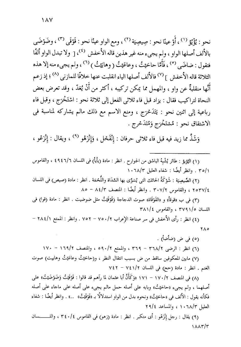 نحو: يؤيؤ، أو عينًا نحو: صيصية، ومع الواو عينًا نحو: قوقى، وضوضى بالألف أصلها الواو، ولم يجيء منه غير هذين قاله الأخفش، [ولا تبدل الواو ألفًا فتقول: ضاضى، فأما حاحيت، وعاعيت (وهاييت)، ولم يجئ منه إلا هذه الثلاثة قاله الأخفش] فالألف أصلها الياء انقلبت عنها خلافًا للمازني؛ إذ زعم أنها منقلبة عن واو، والمهمل مما يمكن تركيبه، أكثر من أن يعد، وقد تعرض بعض النحاة لتراكيب فقال: يزاد قبل فاء ثلاثي الفعل إلى ثلاثة نحو: استخرج، وقبل فاء رباعية إلى اثنين نحو: يتدحرج، ومنع الاسم مع ذلك ما لم يشاركه لمناسبة في الاشتقاق نحو: مستخرج ومتدحرج.