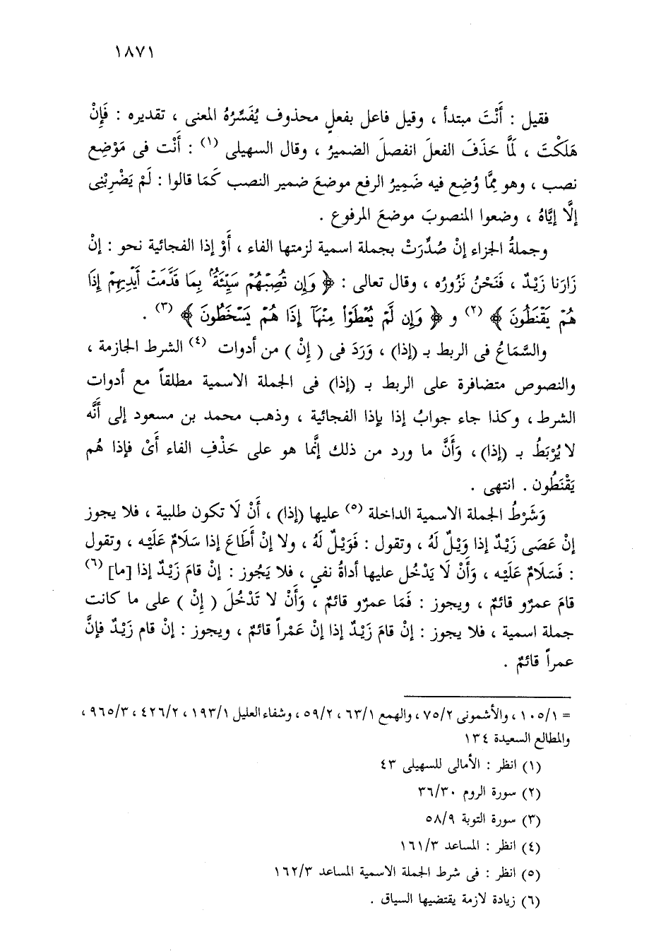 وجملة الجزاء إن صدرت بجملة اسمية لزمتها الفاء، أو إذا الفجائية نحو: إن زارنا زيد، فنحن نزوره، وقال تعالى: «وإن تصبهم سيئه بما قدمت أيديهم إذا هم يقنطون» و «وإن لم يعطوا منها إذا هم يسخطون».