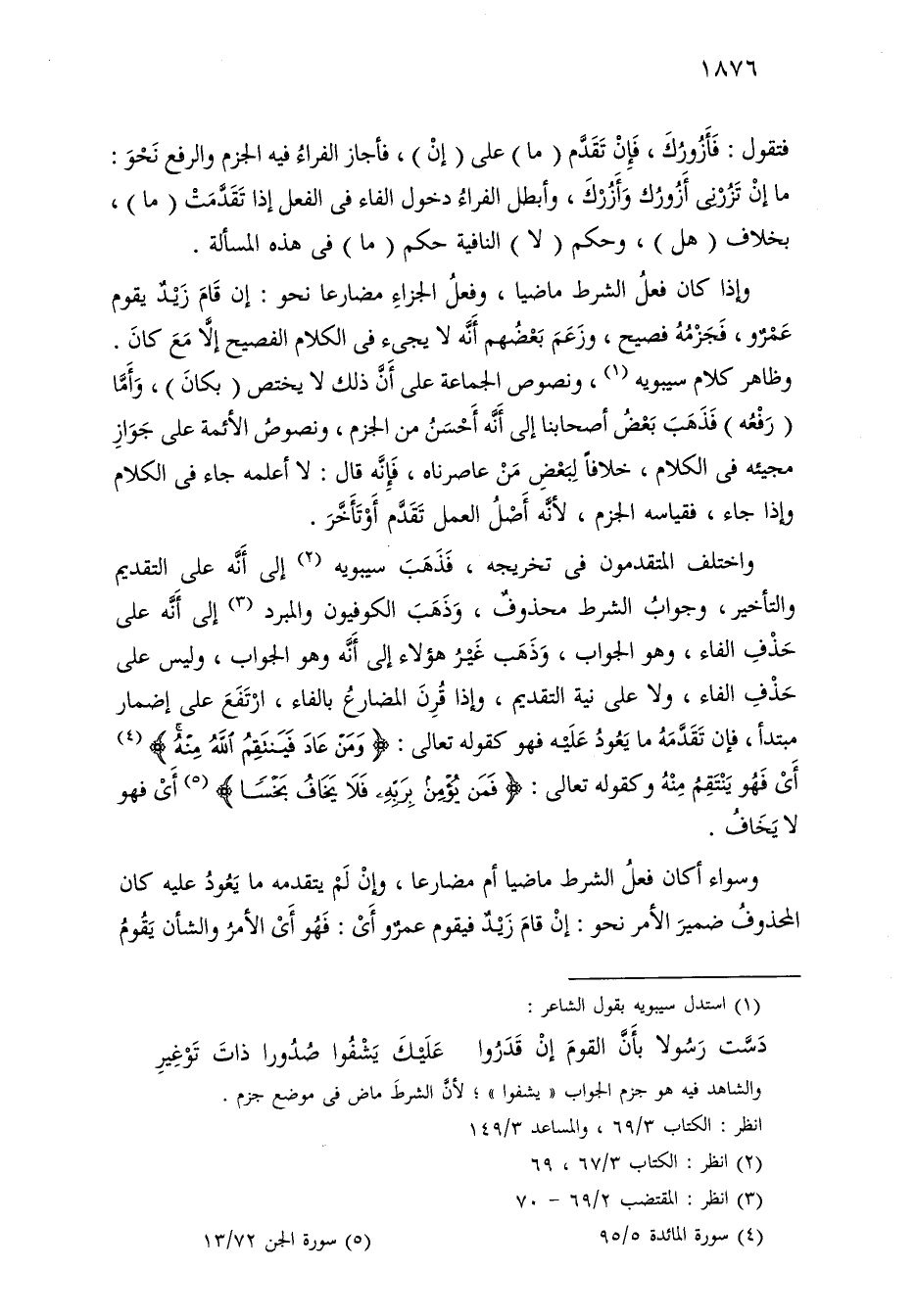 وسواء أكان فعل الشرط ماضيًا أم مضارعًا، وإن لم يتقدمه ما يعود عليه كان المحذوف ضمير الأمر نحو: إن قام زيد فيقوم عمرو أي: فهو أي الأمر والشأن يقوم