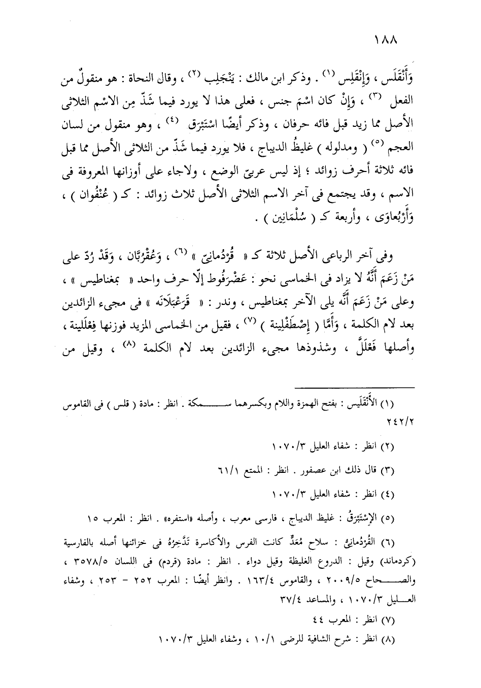 وأنقلس، وإنقلس. وذكر ابن مالك: ينجلب، وقال النحاة: هو منقول من الفعل، وإن كان اسم جنس، فعلى هذا لا يورد فيما شذ من الاسم الثلاثي الأصل مما زيد قبل فائه حرفان، وذكر أيضًا استبرق، وهو منقول من لسان العجم (ومدلوله) غليظ الديباج، فلا يورد فيما شذ من الثلاثي الأصل مما قبل فائه ثلاثة أحرف زوائد؛ إذ ليس عربي الوضع، ولا جاء على أوزانها المعروفة في الاسم، وقد يجتمع في آخر الاسم الثلاثي الأصل ثلاث زوائد: كـ (عنفوان)، وأربعاوي، وأربعة كـ (سلمانين).