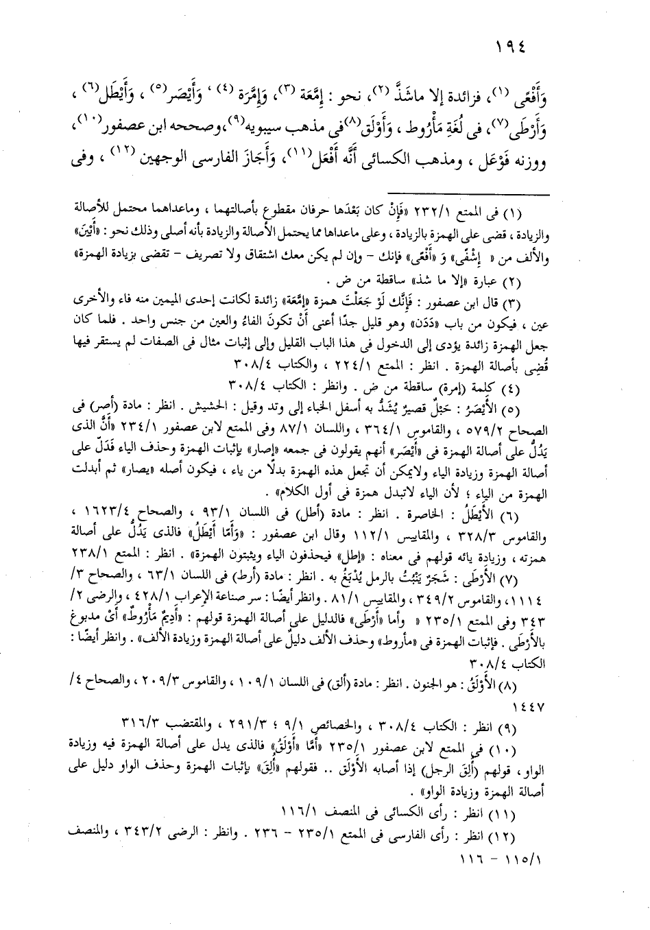 وأفعى، فزائدة إلا ما شذ، نحو: إمعة، وإمرة، وأيصر، وأيطل، وأرطى، في لغة مأروط، وأولق في مذهب سيبويه، وصححه ابن عصفور، ووزنه فوعل، ومذهب الكسائي أنه أفعل، وأجاز الفارسي الوجهين، وفي
