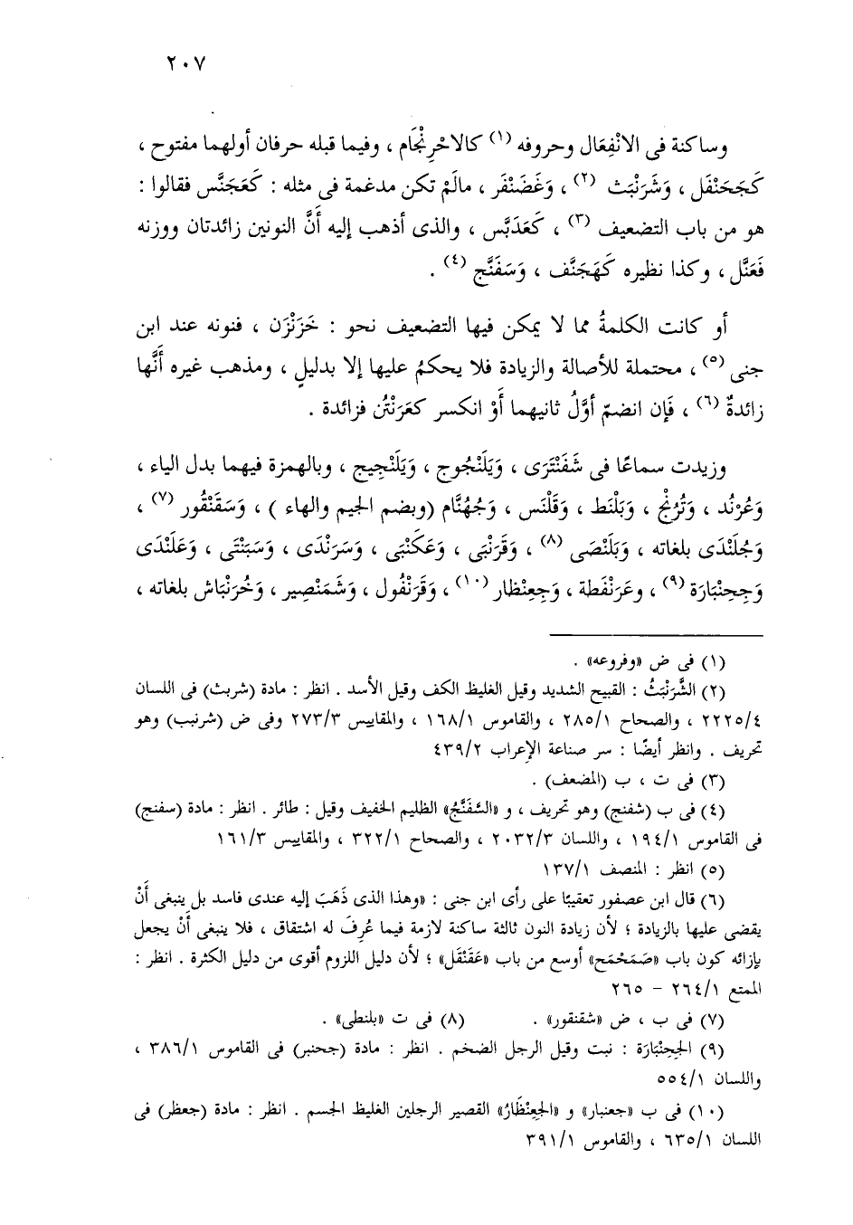 وزيدت سماعًا في شفنترى، ويلنجوج، ويلنجيج، وبالهمزة فيهما بدل الياء، وعرند، وترنج، وبلنط، وقلنس، وجهنام (وبضم الجيم والهاء)، وسقنقور، وجلندى بلغاته، وبلنصى، وقرنبى، وعكنبى، وسرندى، وسبنتى، وعلندى، وجحنبارة، وعرنفطة، وجعنظار، وقرنفول، وشمنصير، وخرنباش بلغاته،