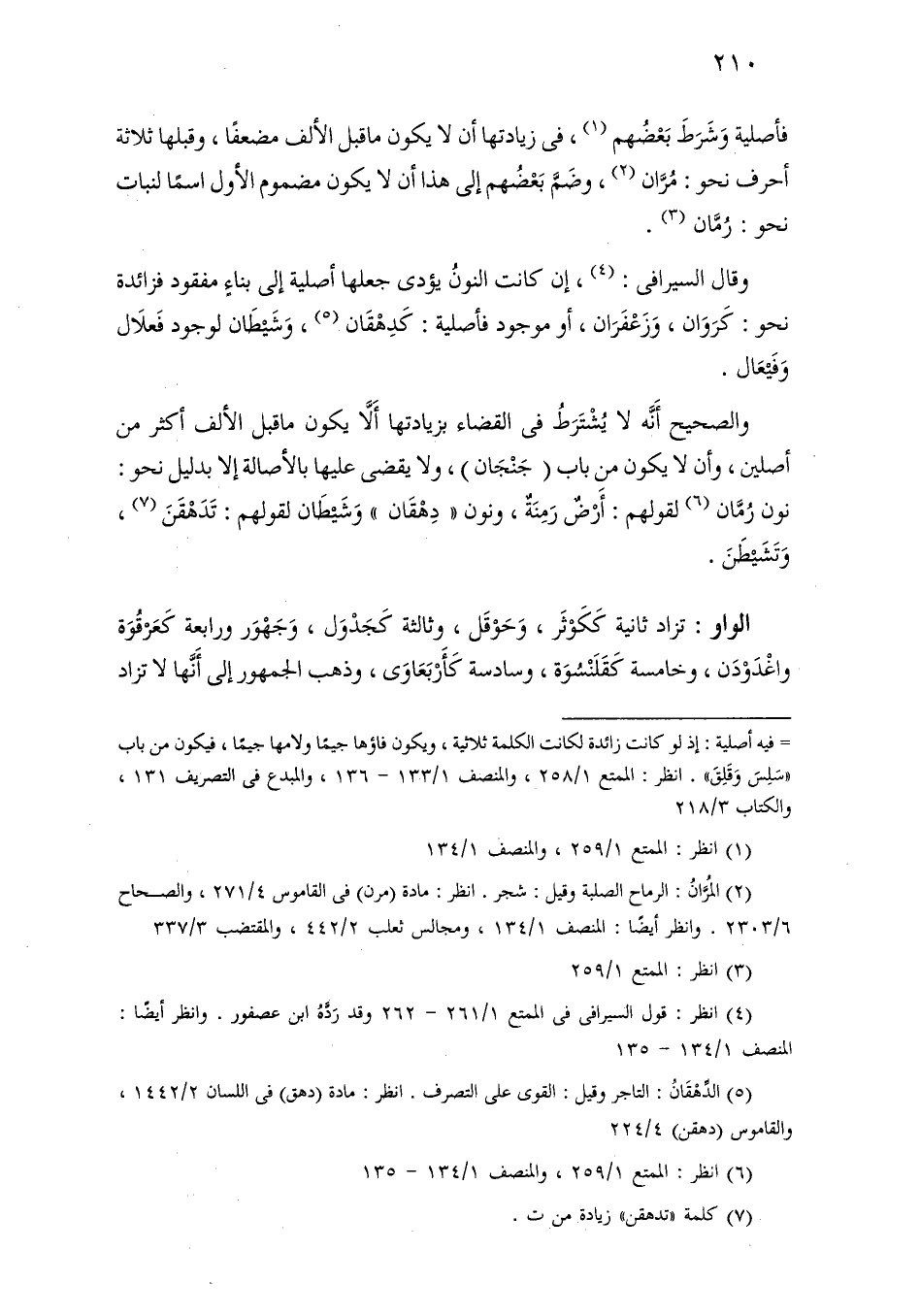 وقال السيرافي: إن كانت النون يؤدي جعلها أصلية إلى بناء مفقود فزائدة نحو: كروان، وزعفران، أو موجود فأصلية: كدهقان، وشيطان لوجود فعلال وفيعال.