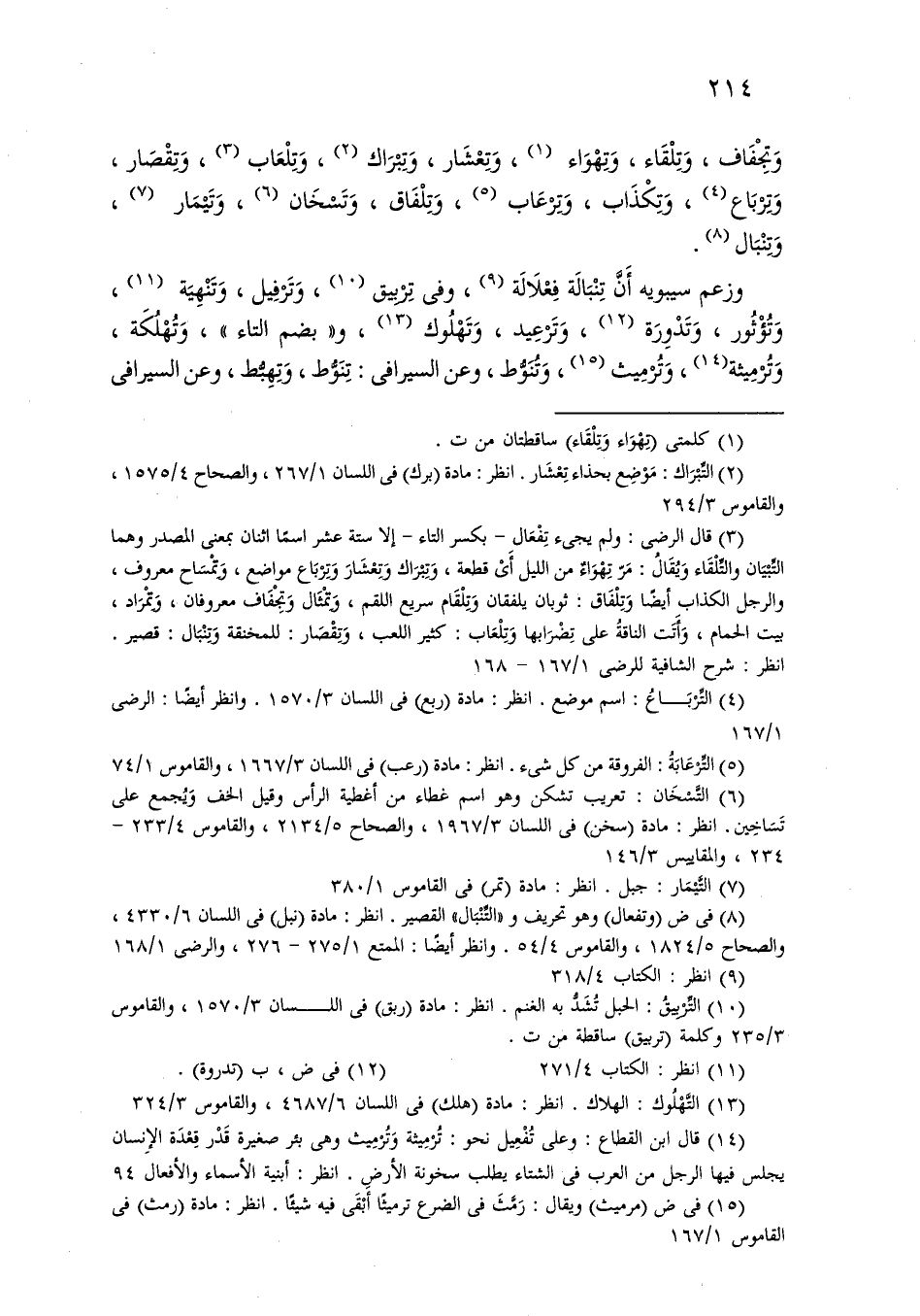 وزعم سيبويه أن تنبالة فعلالة، وفي تربيق، وترفيل، وتنهية، وتؤثور، وتدورة، وترعيد، وتهلوك، و «بضم التاء»، وتهلكة، وترميثة، وترميث، وتنوط، وعن السيرافي: تنوط، وتهبط، وعن السيرافي