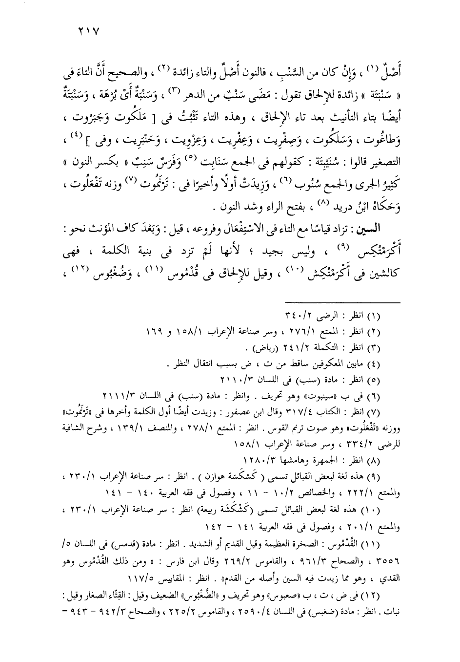 أصل، وإن كان من السنب، فالنون أصل والتاء زائدة، والصحيح أن التاء في «سنبتة» زائدة للإلحاق تقول: مضى سنب من الدهر، وسنبة أي برهة، وسنبتة أيضًا بتاء التأنيث بعد تاء الإلحاق، وهذه التاء تثبت في [ملكوت وجبروت، وطاغوت، وسلكوت، وصفريت، وعفريت، وعزويت، وحنبريت، وفي]، التصغير قالوا: سنيبتة: كقولهم في الجمع سنابت وفرس سنب «بكسر النون» كثير الجرى والجمع سنوب، وزيدت أولاً وأخيرًا في: ترنموت وزنة تفعولت، وحكاه ابن دريد، بفتح الراء وشد النون.