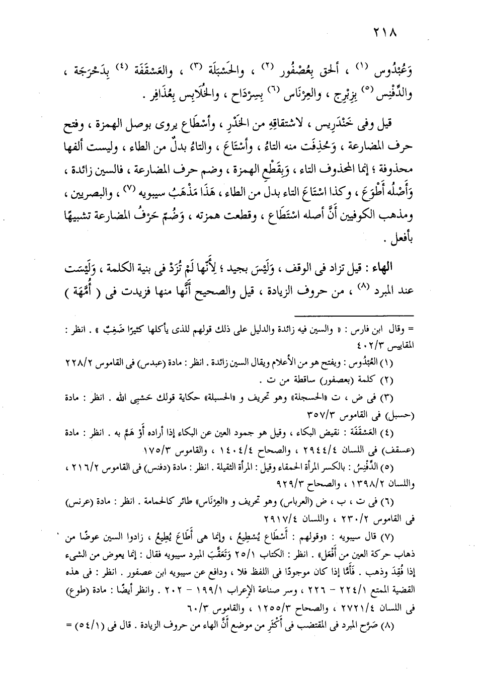 قيل وفي خندريس، لاشتقاقه من الخدر، وأسطاع يروى بوصل الهمزة، وفتح حرف المضارعة، وحذفت منه التاء، وأستاع، والتاء بدل من الطاء، وليست ألفها محذوفة؛ إنما المحذوف التاء، وبقطع الهمزة، وضم حرف المضارعة، فالسين زائدة، وأصله أطوع، وكذا استاع التاء بدل من الطاء، هذا مذهب سيبويه، والبصريين، ومذهب الكوفيين أن أصله استطاع، وقطعت همزته، وضم حرف المضارعة تشبيهًا بأفعل.