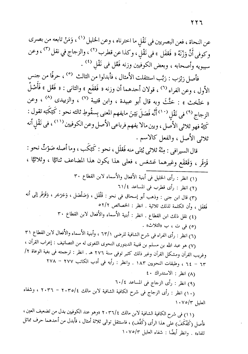 عن النحاة، فعن البصريين في نقل ما اخترناه، وعن الخليل، ومن تابعه من بصري وكوفي أن وزنه «فعفل» في نقل، وكذا عن قطرب، والزجاج في نقل، وعن سيبويه وأصحابه، وبعض الكوفيين وزنه فعل في نقل.