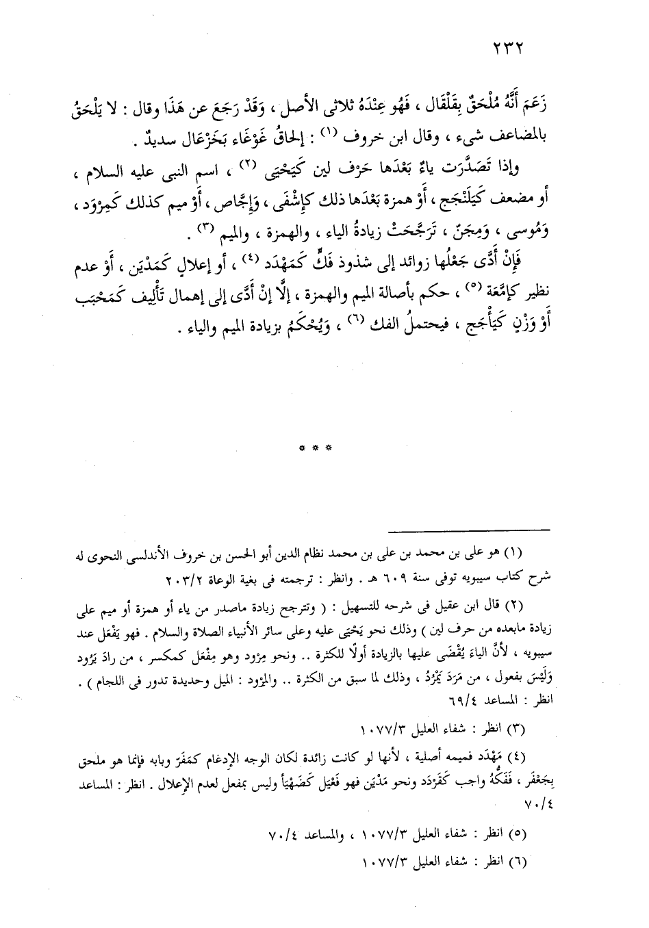 فإن أدى جعلها زوائد إلى شذوذ فك كمهدد، أو إعلال كمدين، أو عدم نظير كإمعة، حكم بأصالة الميم والهمزة، إلا إن أدى إلى إهمال تأليف كمحبب أو وزن كيأجج، فيحتمل الفك، ويحكم بزيادة الميم والياء.
