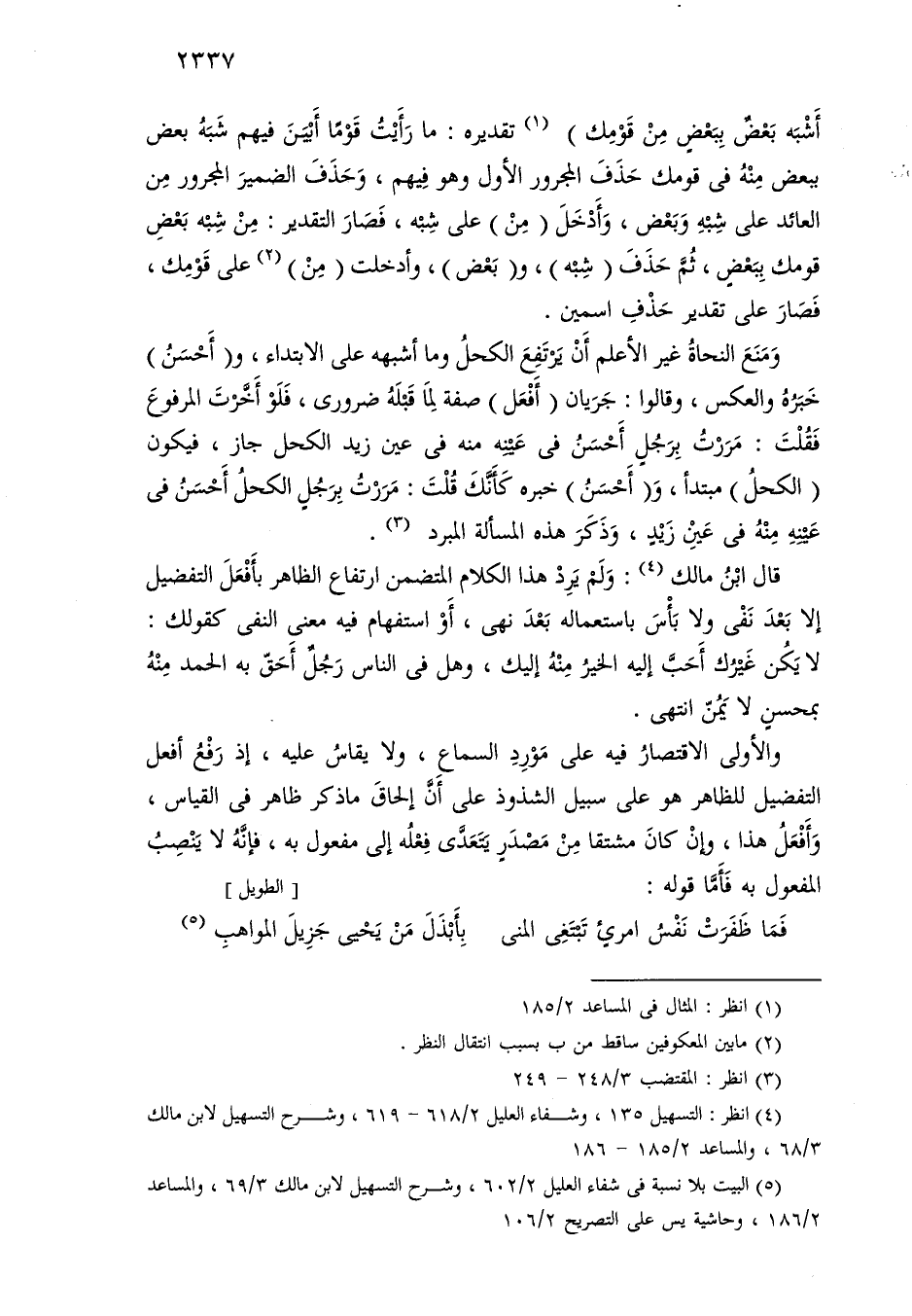 ومنع النحاة غير الأعلم أن يرتفع الكحل وما أشبهه على الابتداء، و (أحسن) خبره والعكس، وقالوا: جريان (أفعل) صفة لما قبله ضروري، فلو أخرت المرفوع فقلت: مررت برجل أحسن في عينه منه في عين زيد الكحل جاز، فيكون (الكحل) مبتدأ، و (أحسن) خبره كأنك قلت: مررت برجل الكحل أحسن في عينه منه في عين زيد، وذكر هذه المسألة المبرد.