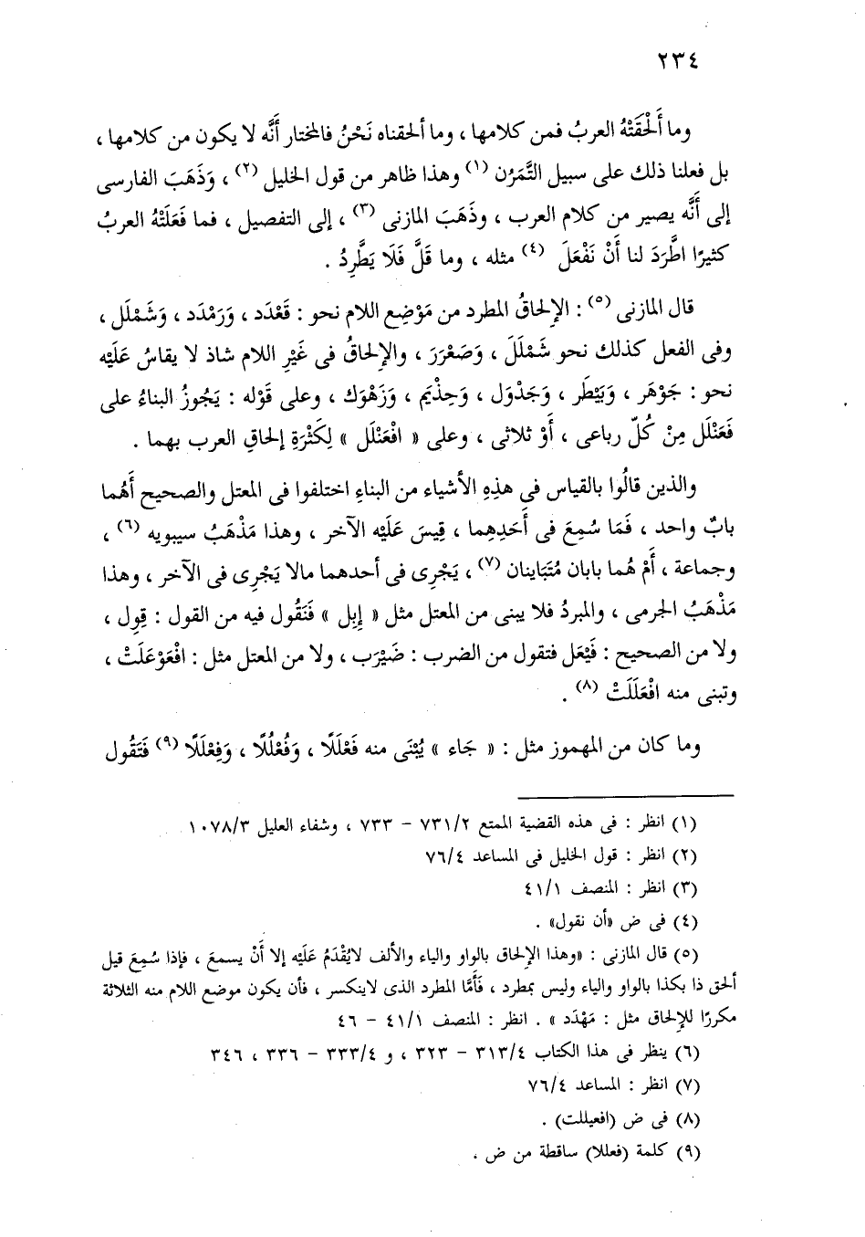 قال المازني: الإلحاق المطرد من موضع اللام نحو: قعدد، ورمدد، وشملل، وفي الفعل كذلك نحو شملل، وصعرر، والإلحاق في غير اللام شاذ لا يقاس عليه نحو: جوهر، وبيطر، وجدول، وحذيم، وزهوك، وعلى قوله: يجوز البناء على فعنلل من كل رباعي، أو ثلاثي، وعلى «افعنلل» لكثرة إلحاق العرب بهما.