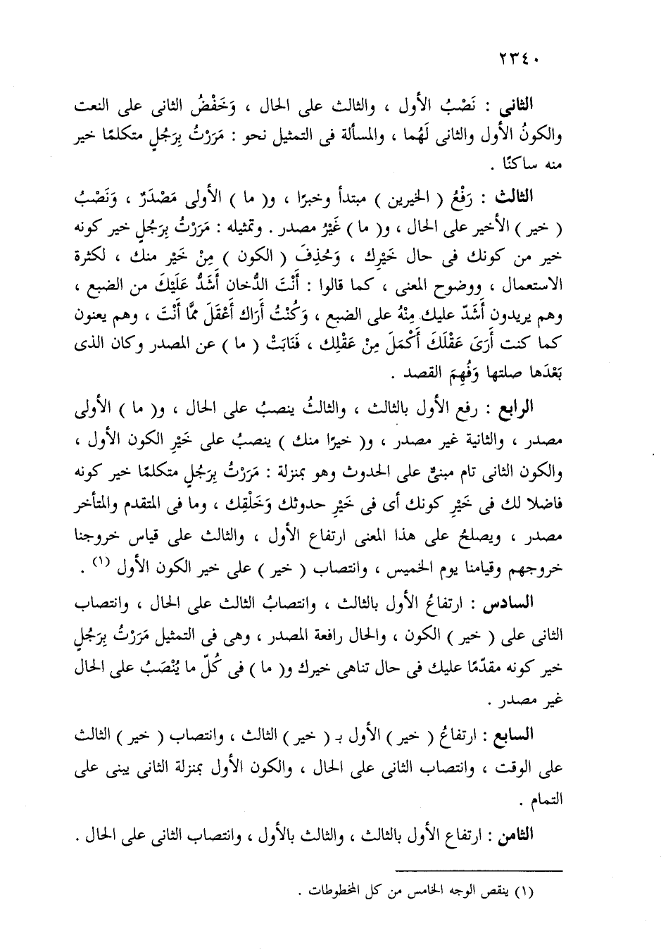 السادس: ارتفاع الأول بالثالث، وانتصاب الثالث على الحال، وانتصاب الثاني على (خير) الكون، والحال رافعة المصدر، وهي في التمثيل مررت برجل خير كونه مقدمًا عليك في حال تناهي خيرك و (ما) في كل ما ينصب على الحال غير مصدر.