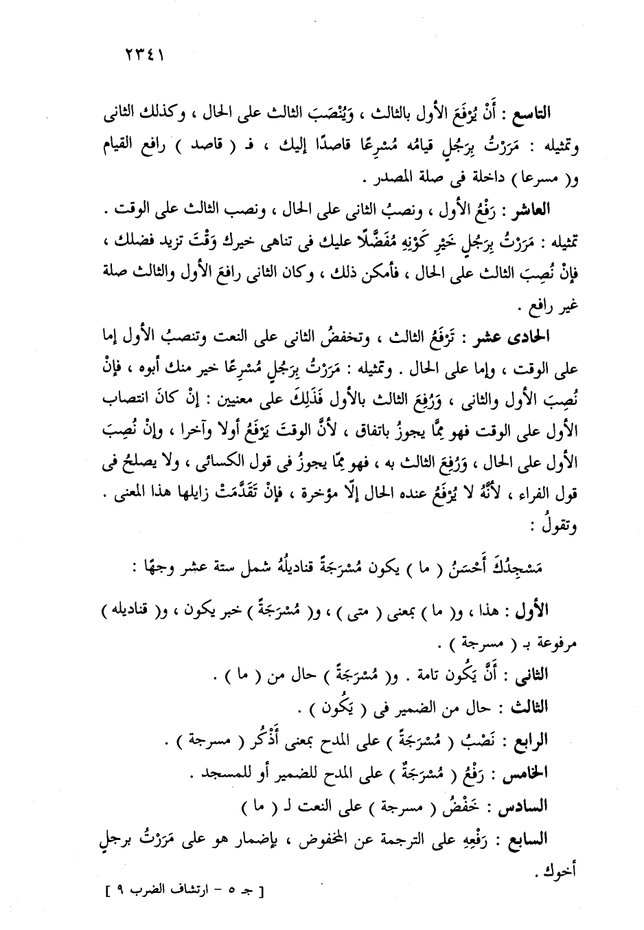 التاسع: أن يرفع الأول بالثالث، وينصب الثالث على الحال، وكذلك الثاني وتمثيله: مررت برجل قيامه مسرعًا قاصدًا إليك، فـ (قاصد) رافع القيام و (مسرعا) داخلة في صلة المصدر.