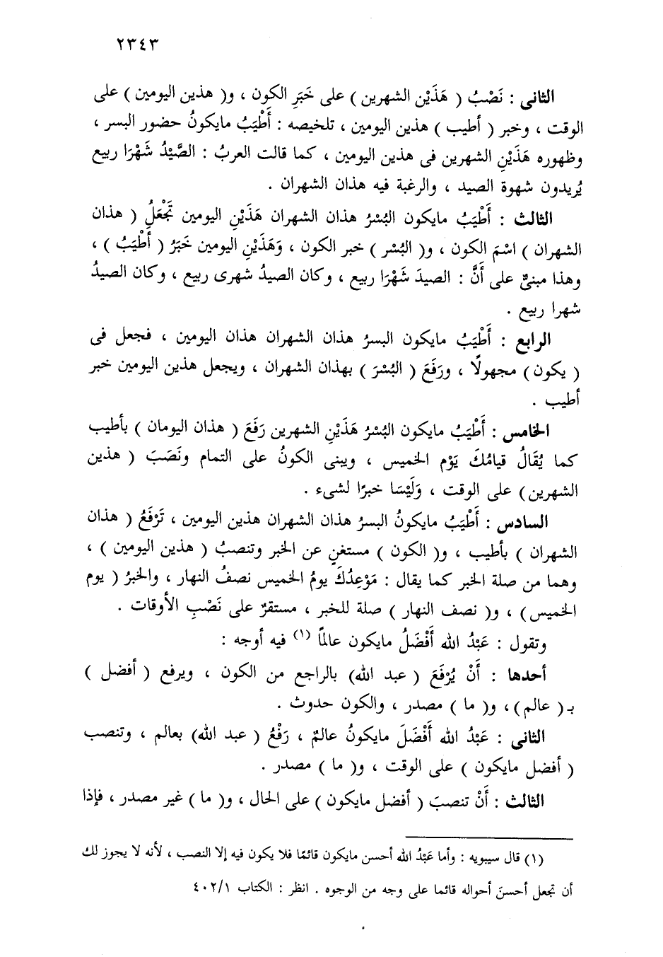 الخامس: أطيب ما يكون البسر هذين الشهرين رفع (هذان اليومان) بأطيب كما يقال قيامك يوم الخميس، ويبنى الكون على التمام ونصب (هذين الشهرين) على الوقت، وليسا خبرًا لشيء.