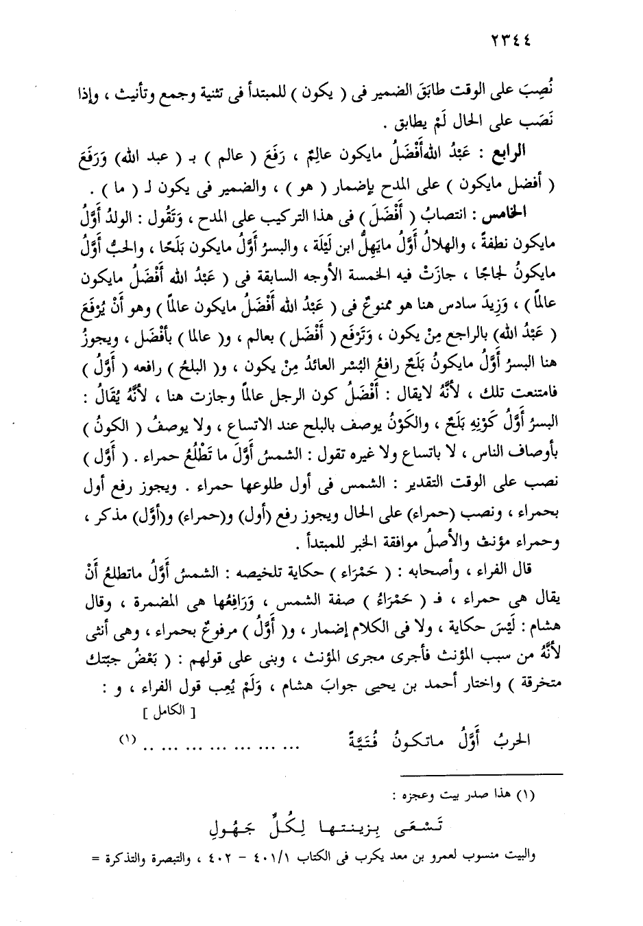 الخامس: انتصاب (أفضل) في هذا التركيب على المدح، وتقول: الولد أول ما يكون نطفة، والهلال أول ما يهل ابن ليلة، والبسر أول ما يكون بلحًا، والحب أول ما يكون لجاجًا، جازت فيه الخمسة الأوجه السابقة في (عبد الله أفضل ما يكون عالمًا)، وزيد سادس هنا هو ممنوع في (عبد الله أفضل ما يكون عالمًا) وهو أن يرفع (عبد الله) بالراجع من يكون، وترفع (أفضل) بعالم، و (عالمًا) بأفضل، ويجوز هنا البسر أول ما يكون بلح رافع البسر العائد من يكون، و (البلح) رافعه (أول) فامتنعت تلك، لأنه لا يقال: أفضل كون الرجل عالمًا وجازت هنا، لأنه يقال: البسر أول كونه بلح، والكون يوصف بالبلح عند الاتساع، ولا يوصف (الكون) بأوصاف الناس، لا باتساع ولا غيره تقول: الشمس أول ما تطلع حمراء. (أول) نصب على الوقت التقدير: الشمس في أول طلوعها حمراء. ويجوز رفع أول بحمراء، ونصب (حمراء) على الحال، ويجوز رفع (أول) و (حمراء) و (أول) مذكر، وحمراء مؤنث والأصل موافقة الخبر للمبتدأ.