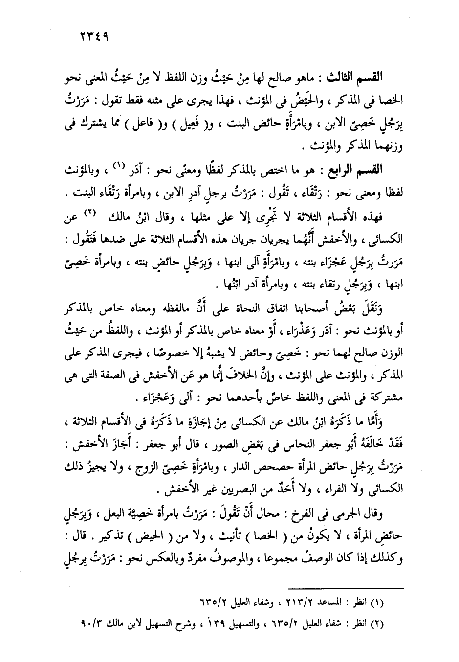 القسم الثالث: ما هو صالح لها من حيث وزن اللفظ لا من حيث المعنى نحو الخصا في المذكر، والحيض في المؤنث، فهذا يجري على مثله فقط تقول: مررت برجل خصي الابن، وبامرأة حائض البنت، و (فعيل) و (فاعل) مما يشترك في وزنهما المذكر والمؤنث.