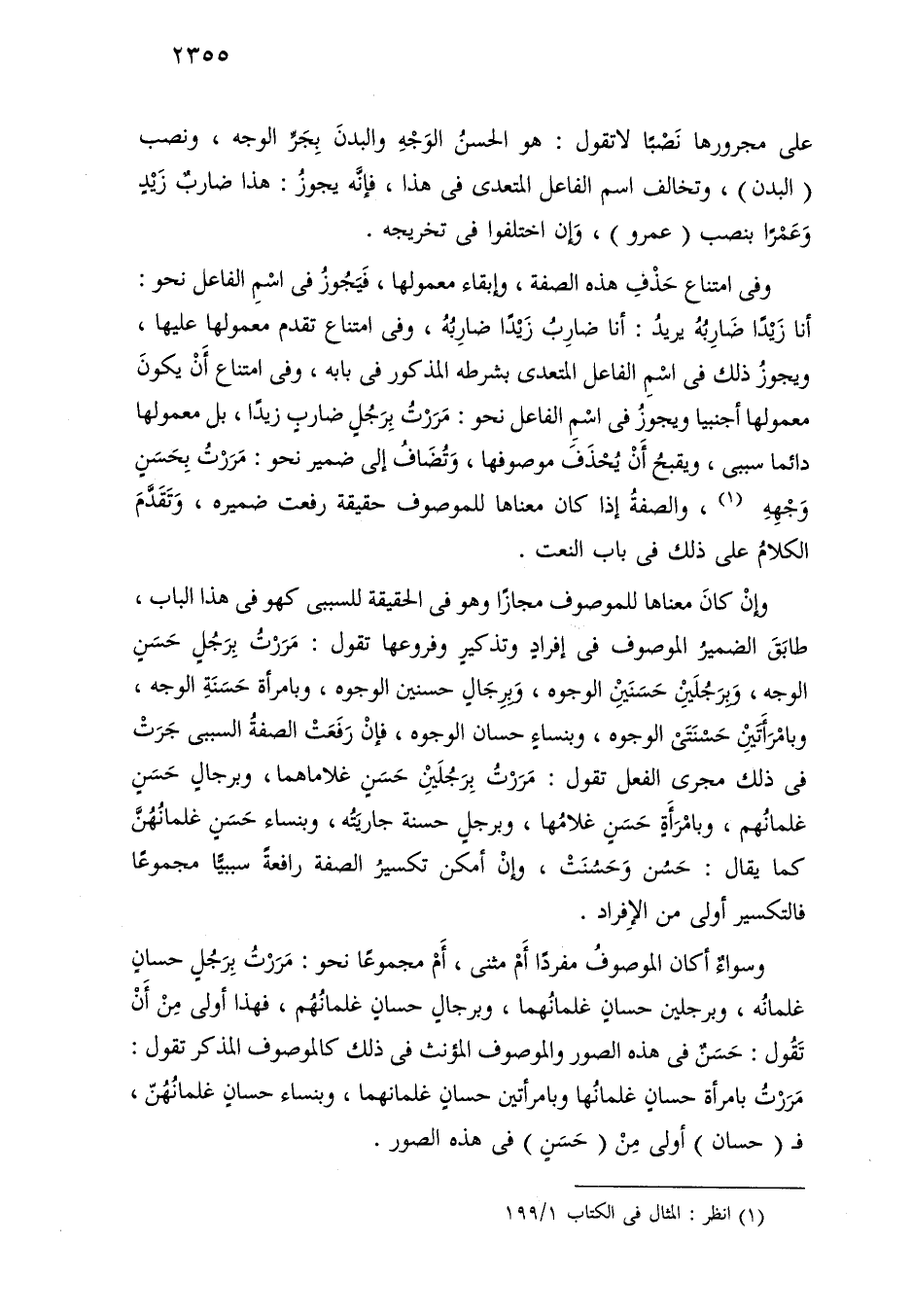 وسواء أكان الموصوف مفردًا أم مثنى، أم مجموعًا نحو: مررت برجل حسان غلمانه، وبرجلين حسان غلمانهما، وبرجال حسان غلمانهم، فهذا أولى من أن تقول: حسن في هذه الصور والموصوف المؤنث في ذلك كالموصوف المذكر تقول: مررت بامرأة حسان غلمانها وبامرأتين حسان غلمانهما، وبنساء حسان غلمانهن، فـ (حسان) أولى من (حسن) في هذه الصور.