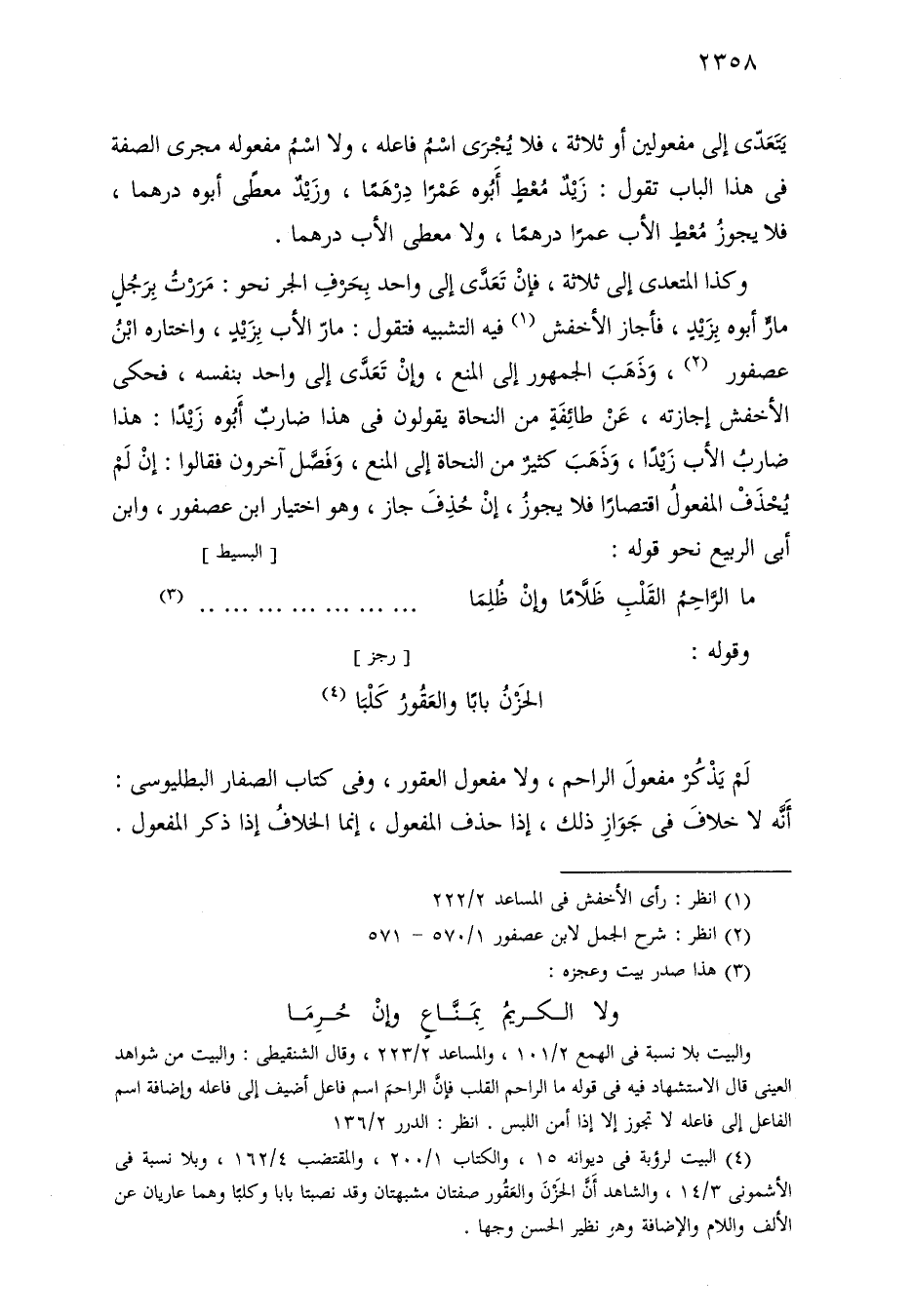 وكذا المتعدي إلى ثلاثة، فإن تعدى إلى واحد بحرف الجر نحو: مررت برجل مار أبوه بزيد، فأجاز الأخفش فيه التشبيه فتقول: مار الأب بزيد، واختاره ابن عصفور، وذهب الجمهور إلى المنع، وإن تعدى إلى واحد بنفسه، فحكى الأخفش إجازته، عن طائفة من النحاة يقولون في هذا ضارب أبوه زيدًا: هذا ضارب الأب زيدًا، وذهب كثير من النحاة إلى المنع، وفصل آخرون فقالوا: إن لم يحذف المفعول اقتصارًا فلا يجوز، إن حذف جاز، وهو اختيار ابن عصفور، وابن أبي الربيع نحو قوله: