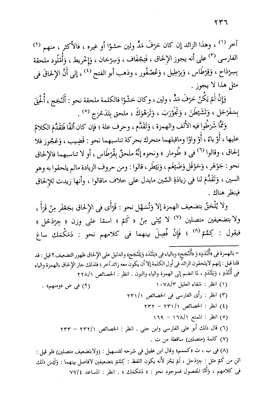 آخر، وهذا الزائد إن كان حرف مد ولين حشوًا أو غيره، فالأكثر، منهم الفارسي على أنه يجوز الإلحاق، فتجفاف، وسرحان، وإخريط، وأملود ملحقة بسرداح، وقرطاس، وبرطيل، وعصفور، وذهب أو الفتح، إلى أن الإلحاق في مثل هذا لا يجوز.