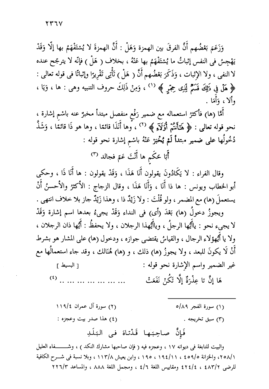 ويجوز دخول (ها) بعد (أي) في النداء وقد يجيء بعدها اسم إشارة وقد لا يجيء نحو: يا أيها الرجل، ويا أايهذا الرجلان، ولا يحفظ: أيها ذان الرجلان، ولا يا أيهؤلاء الرجال، والقياس يقتضي جوازه، ودخول (ها) على المشار هو بشرط أن لا يكون للبعد، ولا يجوز (ها) ذلك، و (ها) هنالك، وقد جاء استعمالها مع غير الضمير واسم الإشارة نحو قوله: