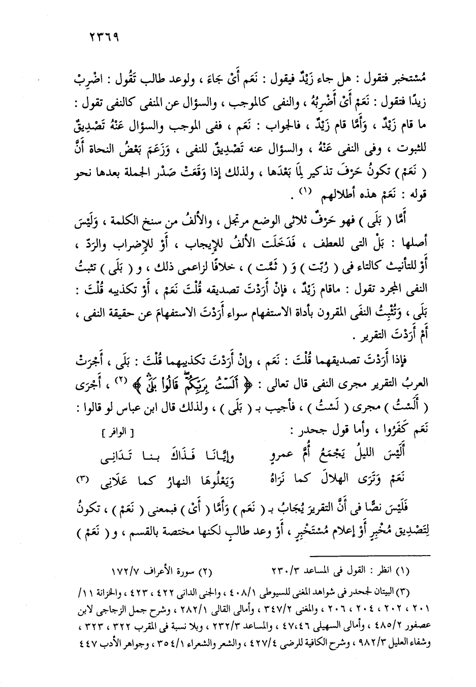 فإذا أردت تصديقهما قلت: نعم، وإن أردت تكذيبهما قلت: بلى، أجرت العرب التقرير مجرى النفي قال تعالى: «ألست بربكم قالوا بلى»، أجرى (ألست) مجرى (لست)، فأجيب بـ (بلى)، ولذلك قال ابن عباس لو قالوا: نعم كفروا، وأما قول جحدر: