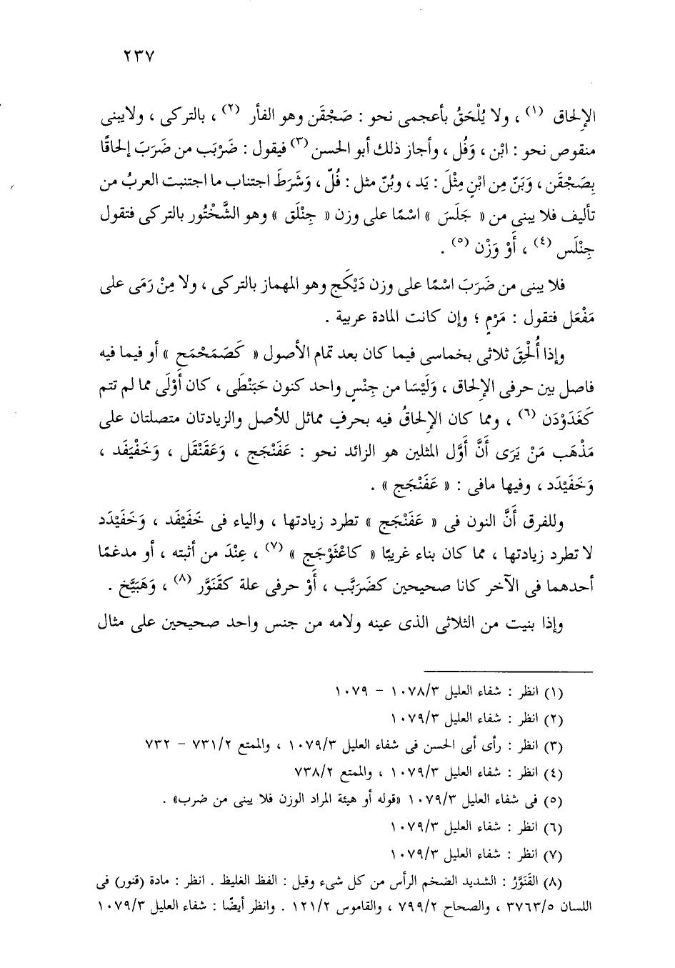 الإلحاق، ولا يلحق بأعجمي نحو: صجقن وهو الفأر، بالتركي، ولا يبنى منقوص نحو: ابن، وفل، وأجاز ذلك أبو الحسن فيقول: ضربب من ضرب إلحاقًا بصجقن، وبن من ابن مثل: يد، وبن مثل: فل، وشرط اجتناب ما اجتنبت العرب من تأليف فلا يبنى من «جلس» اسمًا على وزن «جنلق» وهو الشختور بالتركي فتقول جنلس، أو وزن.