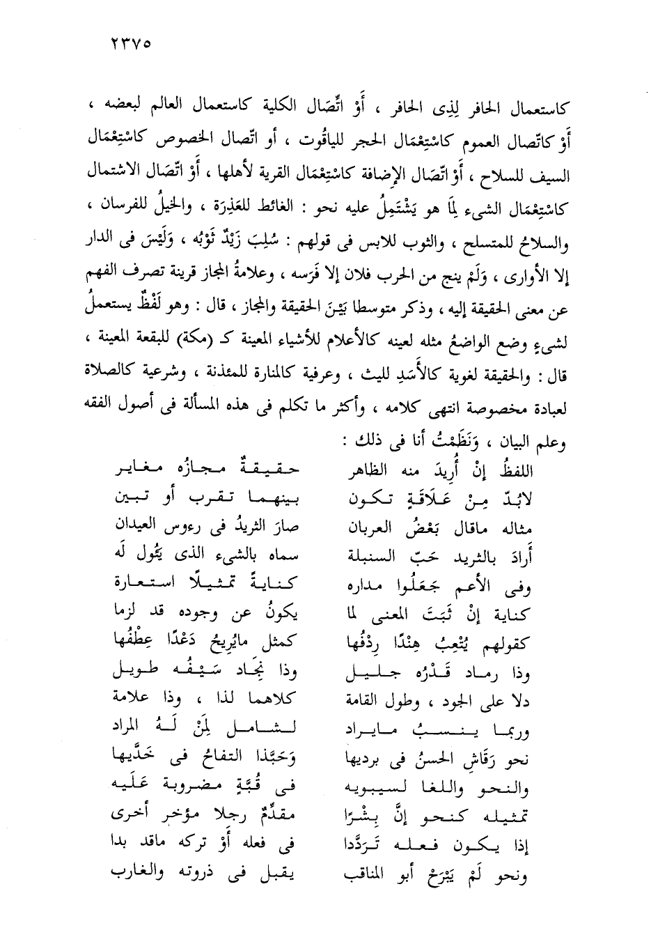 كاستعمال الحافر لذي الحافر، أو اتصال الكلية كاستعمال العالم لبعضه، أو كاتصال العموم كاستعمال الحجر للياقوت، أو اتصال الخصوص كاستعمال السيف للسلاح، أو اتصال الإضافة كاستعمال القرية لأهلها، أو اتصال الاشتمال كاستعمال الشيء لما هو يشتمل عليه نحو: الغائط للعذرة، والخيل للفرسان، والسلاح للمتسلح، والثوب للابس في قولهم: سلب زيد ثوبه، وليس في الدار إلا الأوارى، ولم ينج من الحرب فلان إلا فرسه، وعلامة المجاز قرينة تصرف الفهم عن معنى الحقيقة إليه، وذكر متوسطًا بني الحقيقة والمجاز، قال: وهو لفظ يستعمل لشيء وضع الواضع مثله لعينه كالأعلام للأشياء المعينة كـ (مكة) للبقعة المعينة، قال: والحقيقة لغوية كالأسد لليث، وعرفية كالمنارة للمئذنة، وشرعية كالصلاة لعبادة مخصوصة انتهى كلامه، وأكثر ما تكلم في هذه المسألة في أصول الفقه وعلم البيان، ونظمت أنا في ذلك: