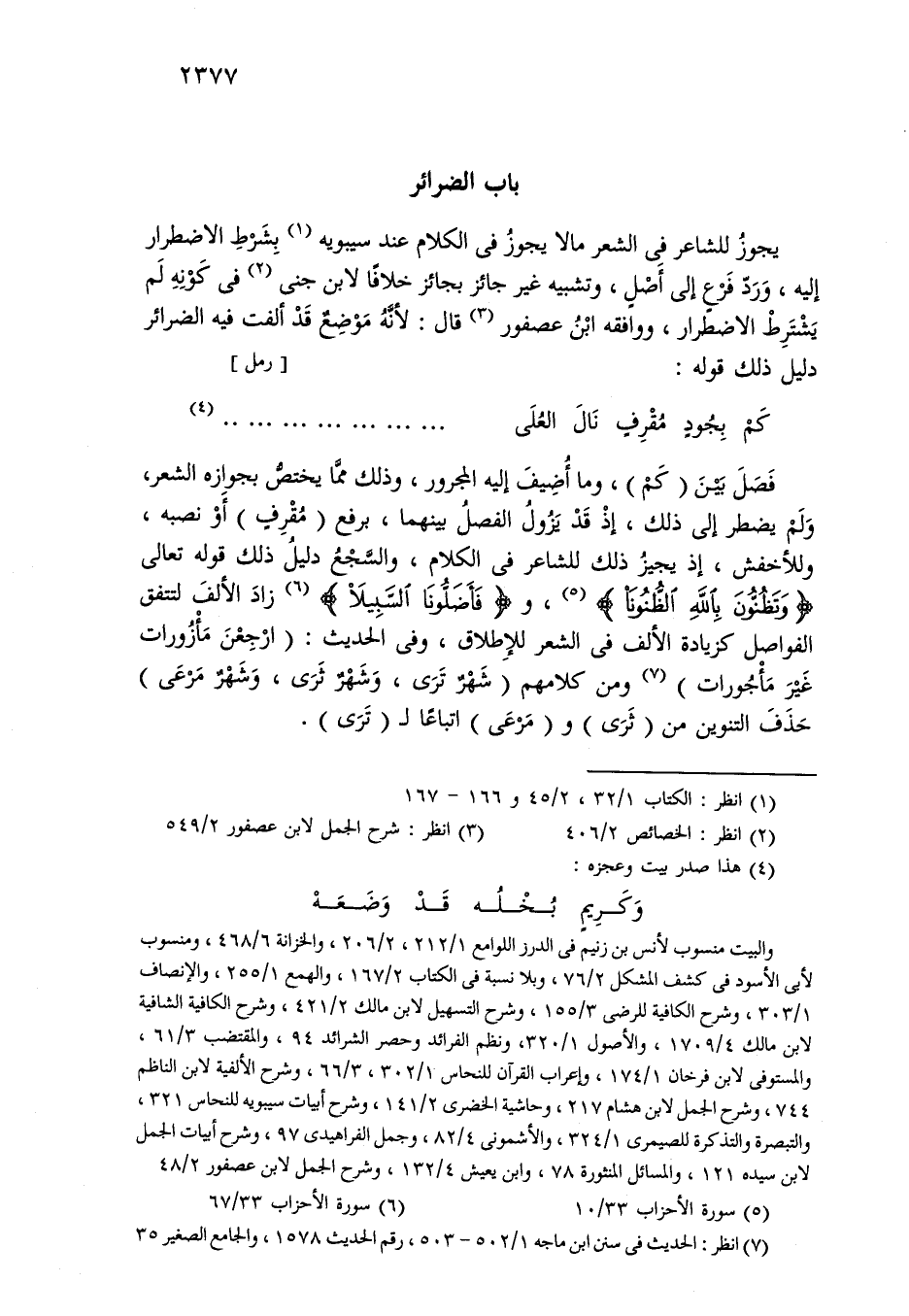 فصل بين (كم)، وما أضيف إليه المجرور، وذلك مما يختص بجوازه الشعر، ولم يضطر إلى ذلك، إذ قد يزول الفصل بينهما، برفع (مقرف) أو نصبه، وللأخفش، إذ يجيز ذلك للشاعر في الكلام، والسجع دليل ذلك قوله تعالى «وتظنون بالله الظنونا»، و «فأضلونا السبيلا» زاد الألف لتتفق الفواصل كزيادة الألف في الشعر للإطلاق، وفي الحديث: (ارجعن مأزورات غير مأجورات) ومن كلامهم (شهر ترى، وشهر ثرى، وشهر مرعى) حذف التنوين من (ثرى) و (مرعى) اتباعًا لـ (ترى).
