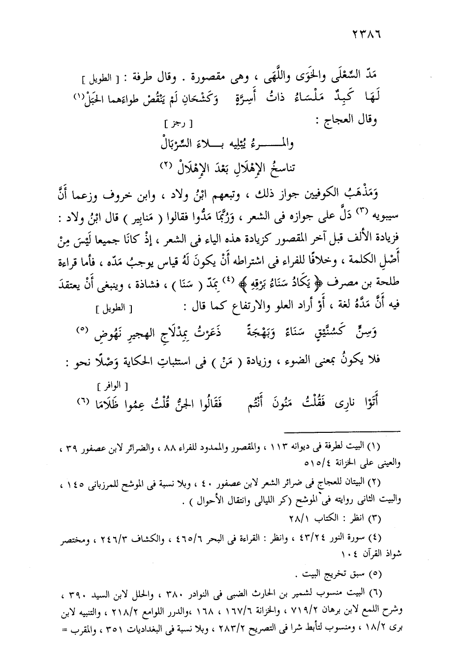 ومذهب الكوفيين جواز ذلك، وتبعهم ابن ولاد، وابن خروف وزعما أن سيبويه دل على جوازه في الشعر، وربما مدوا فقالوا (منابير) قال ابن ولاد: فزيادة الألف قبل آخر المقصور كزيادة هذه الياء في الشعر، إذ كانا جميعا ليس من أصل الكلمة، وخلافًا للفراء في اشتراطه أن يكون له قياس يوجب مده، فأما قراءة طلحة بن مصرف «يكاد سناء برقه» بمد (سنا)، فشاذة، وينبغي أن يعتقد فيه أن مده لغة، أو أراد العلو والارتفاع كما قال: