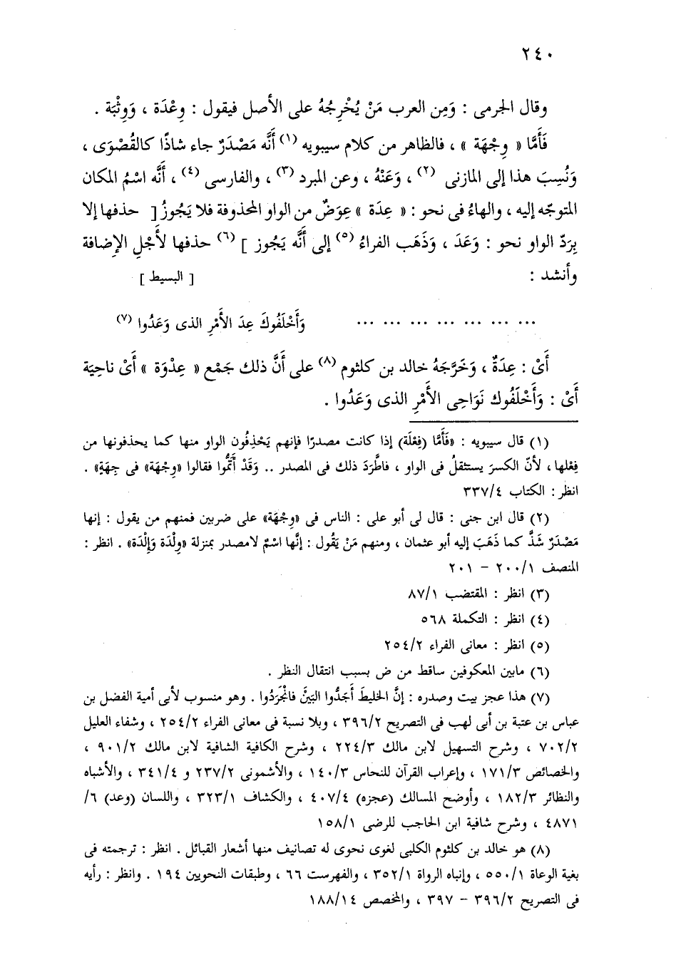 فأما «وجهة»، فالظاهر من كلام سيبويه أنه مصدر جاء شاذًا كالقصوى، ونسب هذا إلى المازني، وعنه، وعن المبرد، والفارسي، أنه اسم المكان المتوجه إليه، والهاء في نحو: «عدة» عوض من الواو المحذوفة فلا يجوز [حذفها إلا برد الواو نحو: وعد، وذهب الفراء إلى أنه يجوز] حذفها لأجل الإضافة وأنشد: