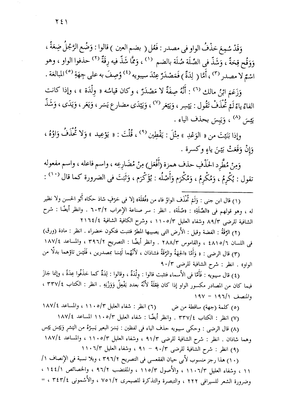 وزعم ابن مالك: أنه صفة لا مصدر، وكان قياسه «ولدة»، وإذا كانت الفاء ياء لم تحذف تقول: ييسر، وييعر، وييدى مضارع يسر، ويعر، ويدى، وشذ يئس، وييس بحذف الياء.