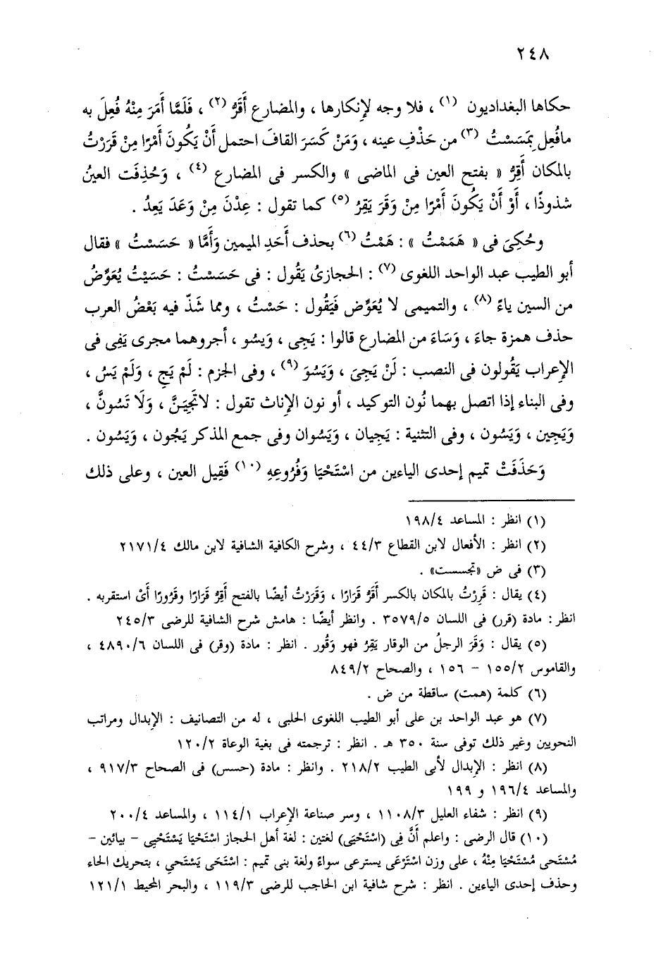 وحكى في «هممت»: همت بحذف أحد الميمين وأما «حسست» فقال أبو الطيب عبد الواحد اللغوي: الحجازي يقول: في حسست: حسيت يعوض من السين ياء، والتميمي لا يعوض فيقول: حست، ومما شذ فيه بعض العرب حذف همزة جاء، وساء من المضارع قالوا: يجي، ويسو، أجروهما مجرى يفي في الإعراب يقولون في النصب: لن يجي، ويسو، وف يالجزم: لم يج، ولم يس، وفي البناء إذا اتصل بهما نون التوكيد، أو نون الإناث تقول: لا تجين، ولا تسون، ويجين، ويسون، وفي التثنية: يجيان، ويسوان وفي جمع المذكر يجون، ويسون.