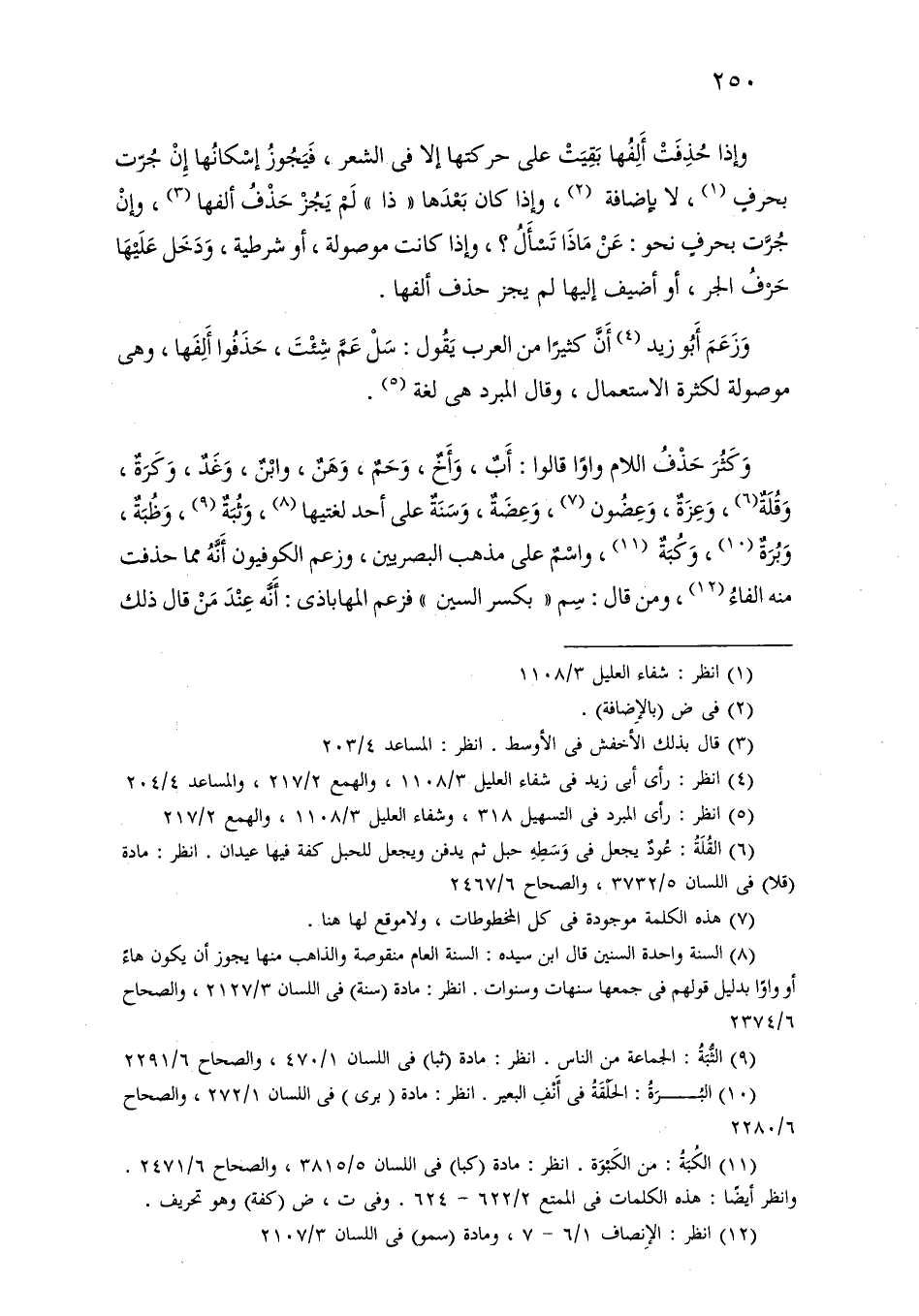 وكثر حذف اللام واوًا قالوا: أب، وأخ، وحم، وهن، وابن، وغد، وكرة، وقلة، وعزة، وعضون، وعضة، وسنة على أحد لغتيها، وثبة، وظبة، وبرة، وكبة، واسم على مذهب البصريين، وزعم الكوفيون أنه مما حذفت منه الفاء، ومن قال: سم «بكسر السين» فزعم المهاباذي: أنه عند من قال ذلك