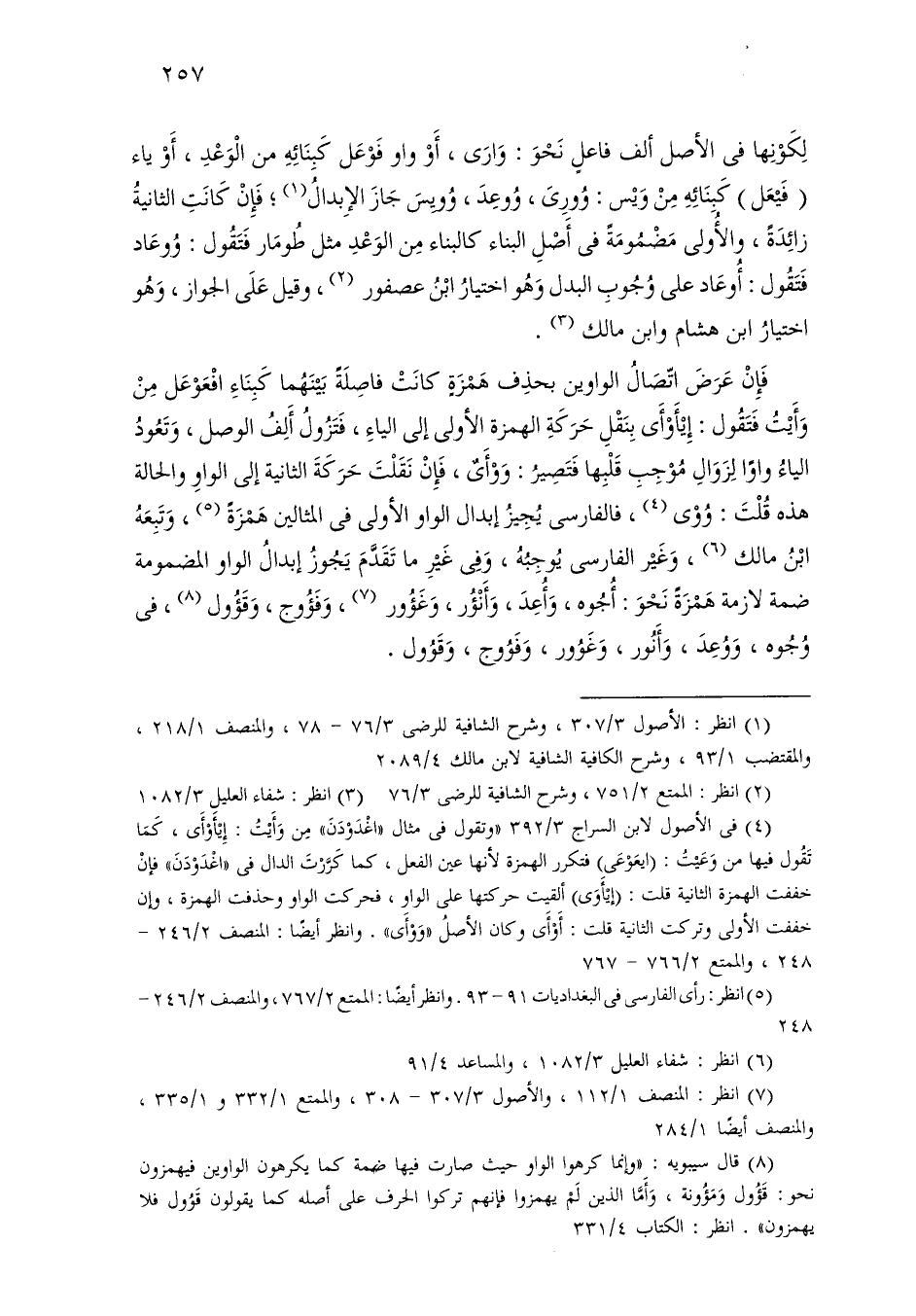 فإن عرض اتصال الواوين بحذف همزة كانت فاصلة بينهما كبناء افعوعل من وأيت فتقول: إيأوأى بنقل حركة الهمزة الأولى إلى الياء، فتزول ألف الوصل، وتعود الياء واوًا لزوال موجب قلبها فتصير: ووأى، فإن نقلت حركة الثانية إلى الواو والحالة هذه قلت: ووى، فالفارسي يجيز إبدال الواو الأولى في المثالين همزة، وتبعه ابن مالك، وغير الفارسي يوجبه وفي غير ما تقدم يجوز إبدال الواو المضمومة ضمة لازمة همزة نحو: أجوه، وأعد، وأنؤر، وغؤور، وفؤوج، وقؤول، في وجوه، ووعد، وأنور، وغوور، وفوج، وقوول.