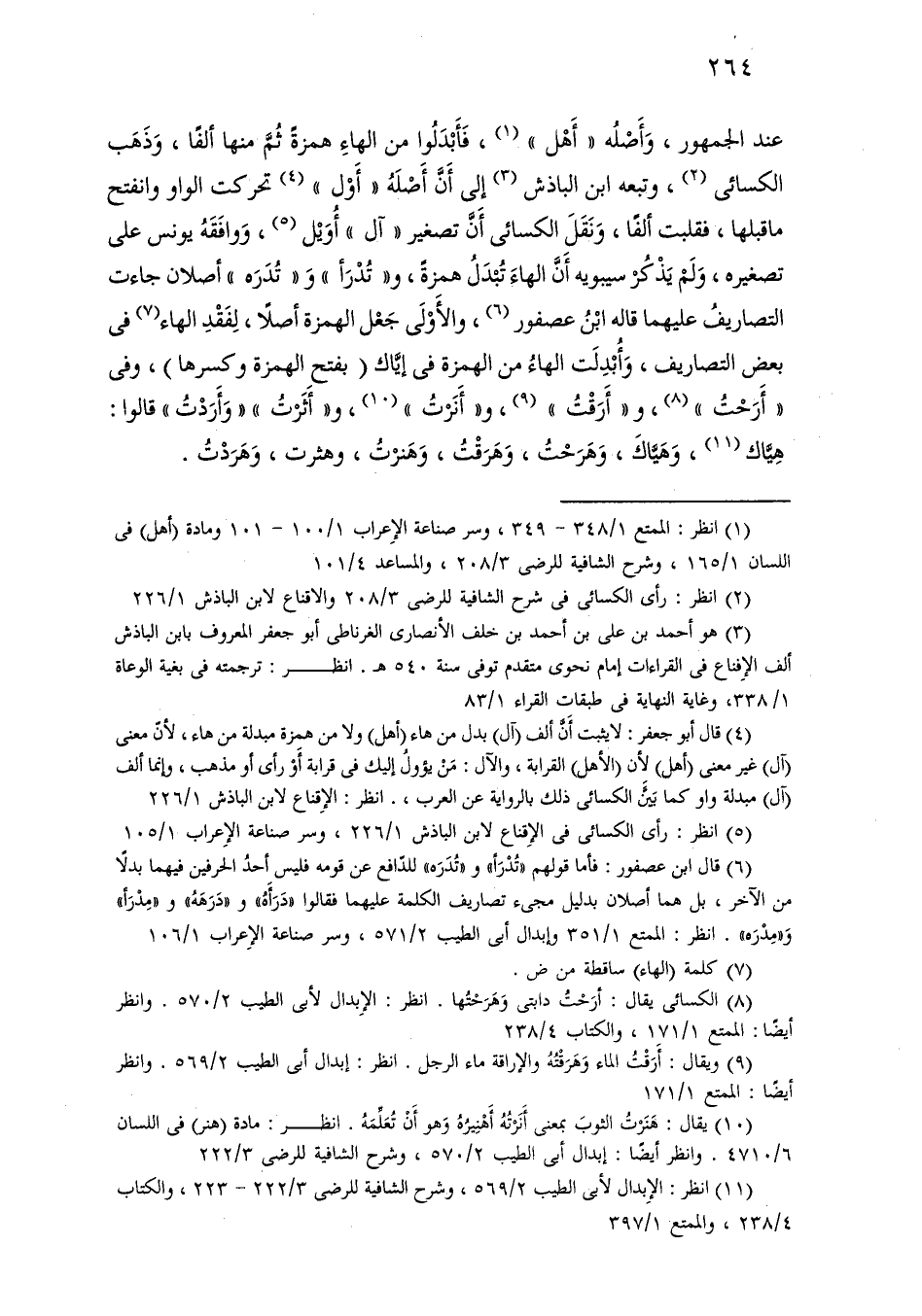 عند الجمهور، وأصله «أهل»، فأبدلوا من الهاء همزة ثم منها ألفًا، وذهب الكسائي، وتبعه ابن الباذش إلى أن أصله «أول» تحركت الواو وانفتح ما قبلها، فقلبت ألفًا، ونقل الكسائي أن تصغير «آل» أويل، ووافقه يونس على تصغيره، ولم يذكر سيبويه أن الهاء تبدل همزة، و «تدرأ» و «تدره» أصلان جاءت التصاريف عليهما قال ابن عصفور، والأولى جعل الهمزة أصلاً، لفقد الهاء في بعض التصاريف، وأبدلت الهاء من الهمزة في إياك (بفتح الهمزة وكسرها)، وفي «أرحت»، و «أرقت»، و «أنرت»، و «أثرت» «وأردت» قالوا: هياك، وهياك، وهرحت، وهرقت، وهنرت، وهثرت، وهردت.