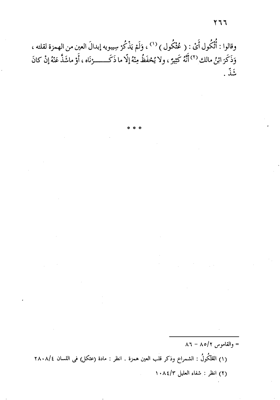 وقالوا: أثكول أي: (عثكول)، ولم يذكر سيبويه إبدال العين من الهمزة لقلته، وذكر ابن مالك أنه كثير، ولا يحفظ منه إلا ما ذكرناه، أو ما شذ عنه إن كان شذ.