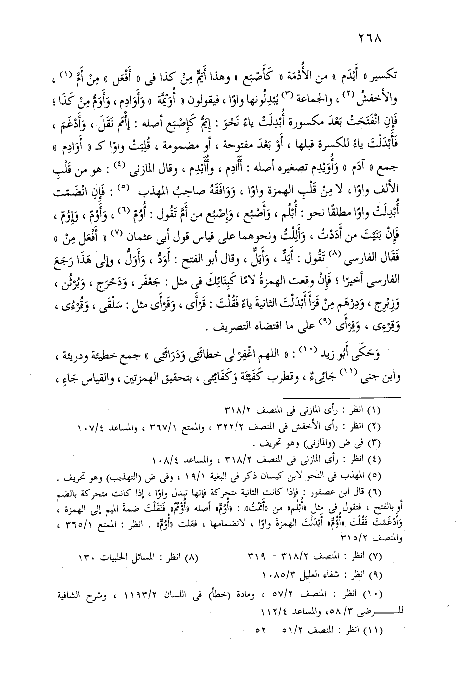 تكسير «أيدم» من الأدمة «كأصبع» وهذا أيم من كذا في «أفعل» من أم، والأخفش، والجماعة يبدلونها واوًا، فيقولون «أويمة» وأوادم، وأوم من كذا؛ فإن انفتحت بعد مكسورة أبدلت ياء نحو: إيم كإصبع أصله: إأمم نقل، وأدغم، فأبدلت ياء للكسرة قبلها، أو بعد مفتوحة، أو مضمومة، قلبت واوًا كـ «أوادم» جمع «آدم» وأويدم تصغيره أصله: أأادم، وأأيدم، وقال المازني: هو من قلب الألف واوًا، لا من قلب الهمزة واوًا، ووافقه صاحب المهذب: فإن انضمت أبدلت واوًا مطلقًا نحو: أبلم، وأصبع، وإصبع من أم تقول: أوم، وأوم، وإوم، فإن بنيت من أددت، وأللت ونحوهما على قياس قول أبي عثمان «أفعل من» فقال الفارسي تقول: أيد، وأيل، وقال أبو الفتح: أود، وأول، وإلى هذا رجع الفارسي أخيرًا؛ فإن وقعت الهمزة لامًا كبنائك في مثل: جعفر، ودحرج، وبرثن، وزبرج، ودرهم من قرأ أبدلت الثانية ياء فقلت: قرأى، وقرأى مثل: سلقى، وقرئ، وقرءى، وقرأى على ما اقتضاه التصريف.