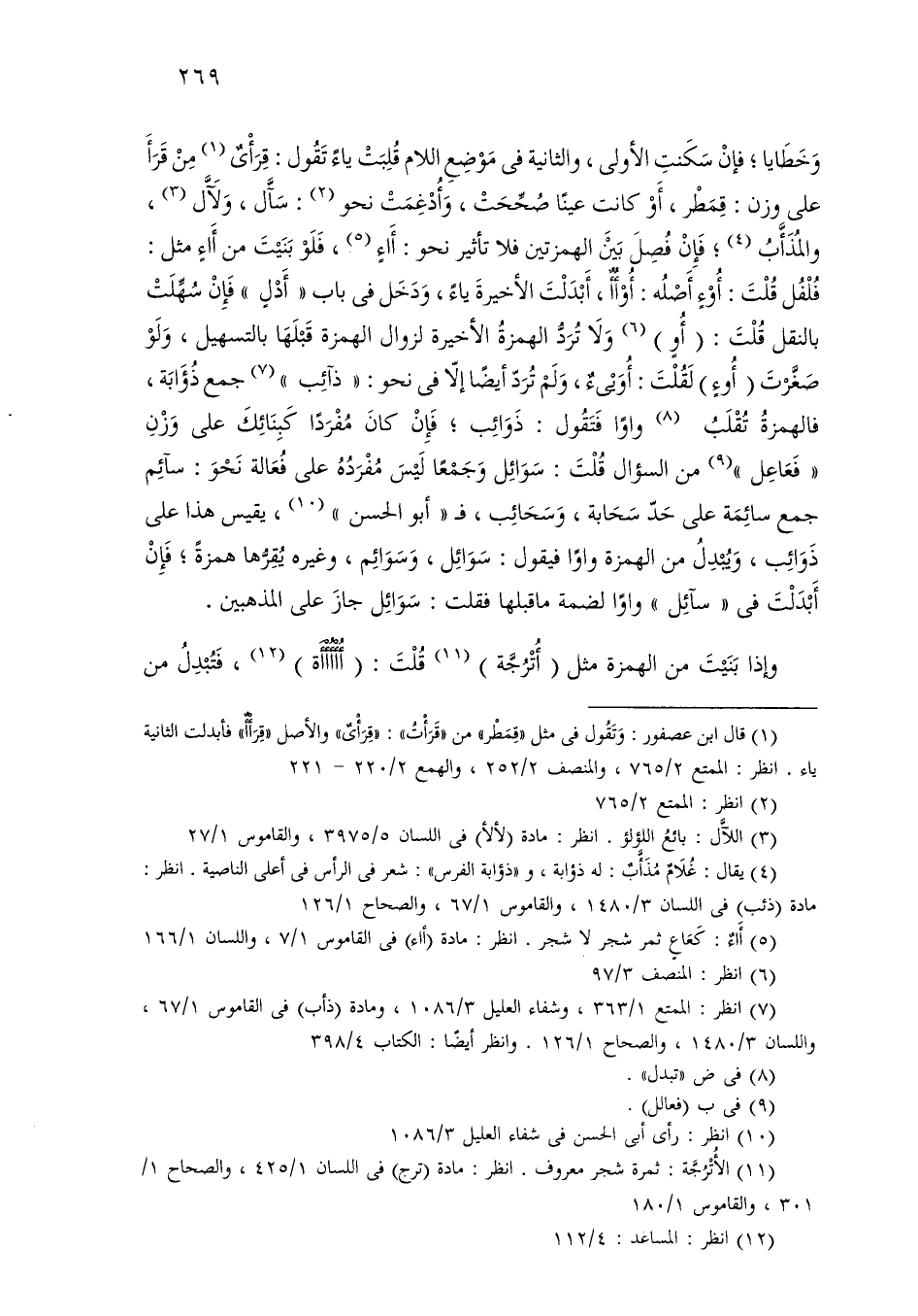 وخطايا؛ فإن سكنت الأولى، والثانية في موضع اللام قلبت ياء تقول: قرأى من قرأ على وزن: قمطر، أو كانت عينًا صححت، وأدغمت نحو: سآل، ولآل، والمذأب؛ فإن فصل بين الهمزتين فلا تأثير نحو: أاء، فلو بنيت من أاء مثل: فلفل قلت: أوء أصله: أوأأ، أبدلت الأخيرة ياء، ودخل في باب «أدل» فإن سهلت بالنقل قلت: (أو) ولا ترد الهمزة الأخيرة لزوال الهمزة قبلها بالتسهيل، ولو صغرت (أوء) لقلت: أويئ، ولم ترد أيضًا إلا في نحو: «ذآئب» جمع ذؤابة، فالهمزة تقلب واوًا فتقول: ذوائب؛ فإن كان مفردًا كبنائك على وزن «فعاعل» من السؤال قلت: سوائل وجمعًا ليس مفرده على فعالة نحو: سآئم جمع سائمة على حد سحابة، وسحائب، فـ «أبو الحسن»، يقيس هذا على ذوائب، ويبدل من الهمزة واوًا فيقول: سوائل، وسوائم، وغيره يقرها همزة؛ فإن أبدلت في «سآئل» واوًا لضمة ما قبلها فقلت: سوائل جاز على المذهبين.